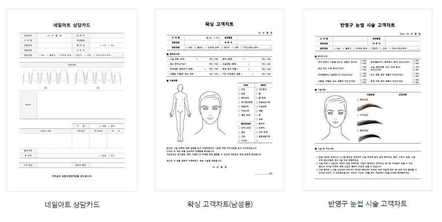 속눈썹 시술, 네일아트, 문신, 피부 에스테틱 등 미용 시술 업계에서 가장 많이 사용하는 작업 서식들을 모았습니다.