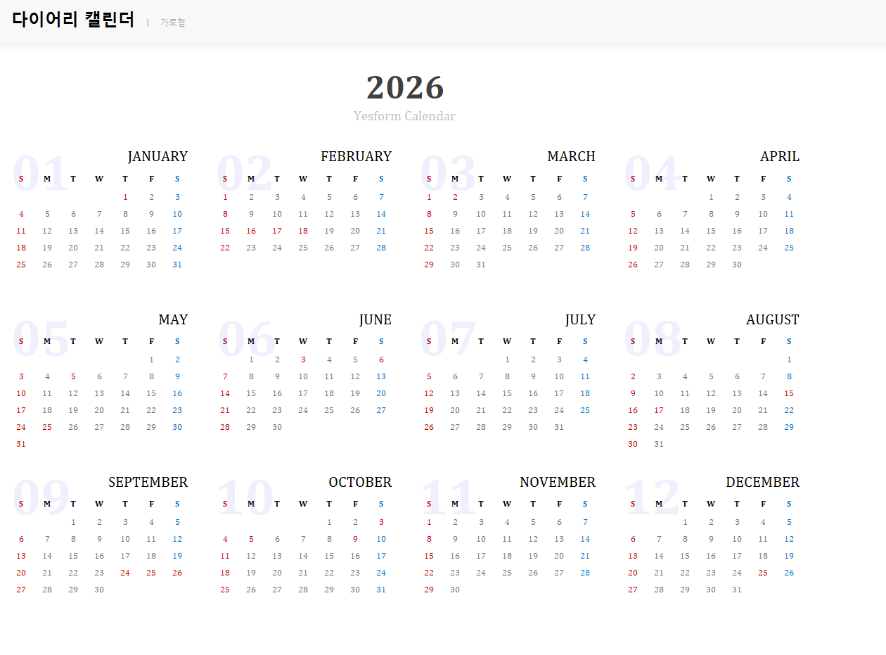 [2026년] 달력_Yearly Calendar - 예스폼 엑셀서식