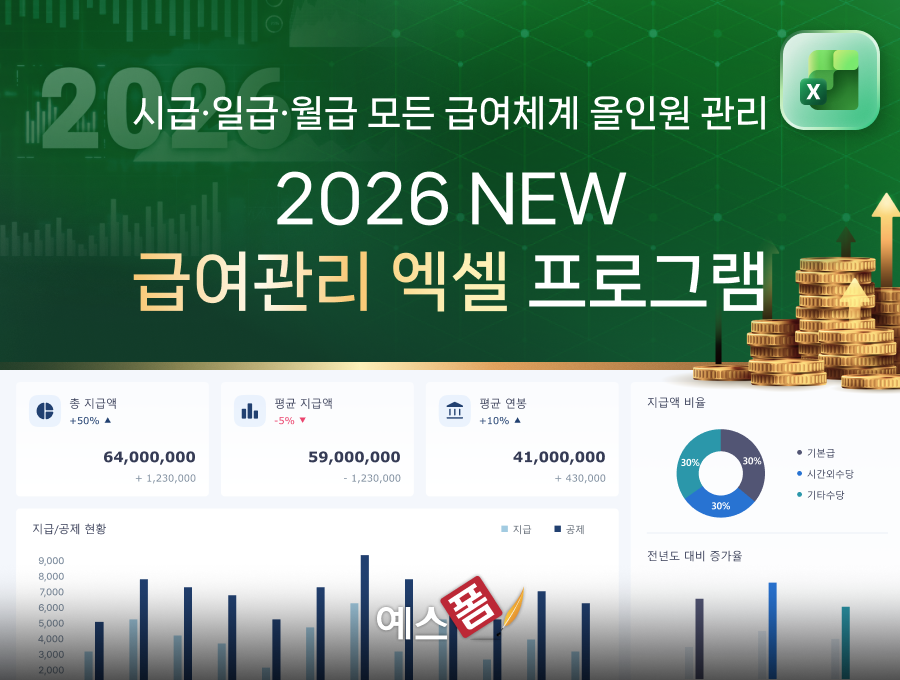 2026년 새해, 더 이상 복잡한 급여 계산 때문에 야근하지 마세요. 예스폼의 급여관리 프로그램과 함께라면 정확하고 빠른 급여 관리가 가능합니다. 급여관리 프로그램을 찾고 계신다면 꼭 필요한 사이트 예스폼에서 2026 NEW 급여관리 엑셀 프로그램을 지금 바로 만나보세요. 시급·일급·월급 올인원 관리부터 급여명세서 발급, 급여관리대장 작성, 급여계산기 기능까지 당신의 급여 업무를 완벽하게 지원해드립니다. 엑셀 하나로 끝내는 스마트한 인사총무의 시작, 예스폼과 함께하세요! ✨