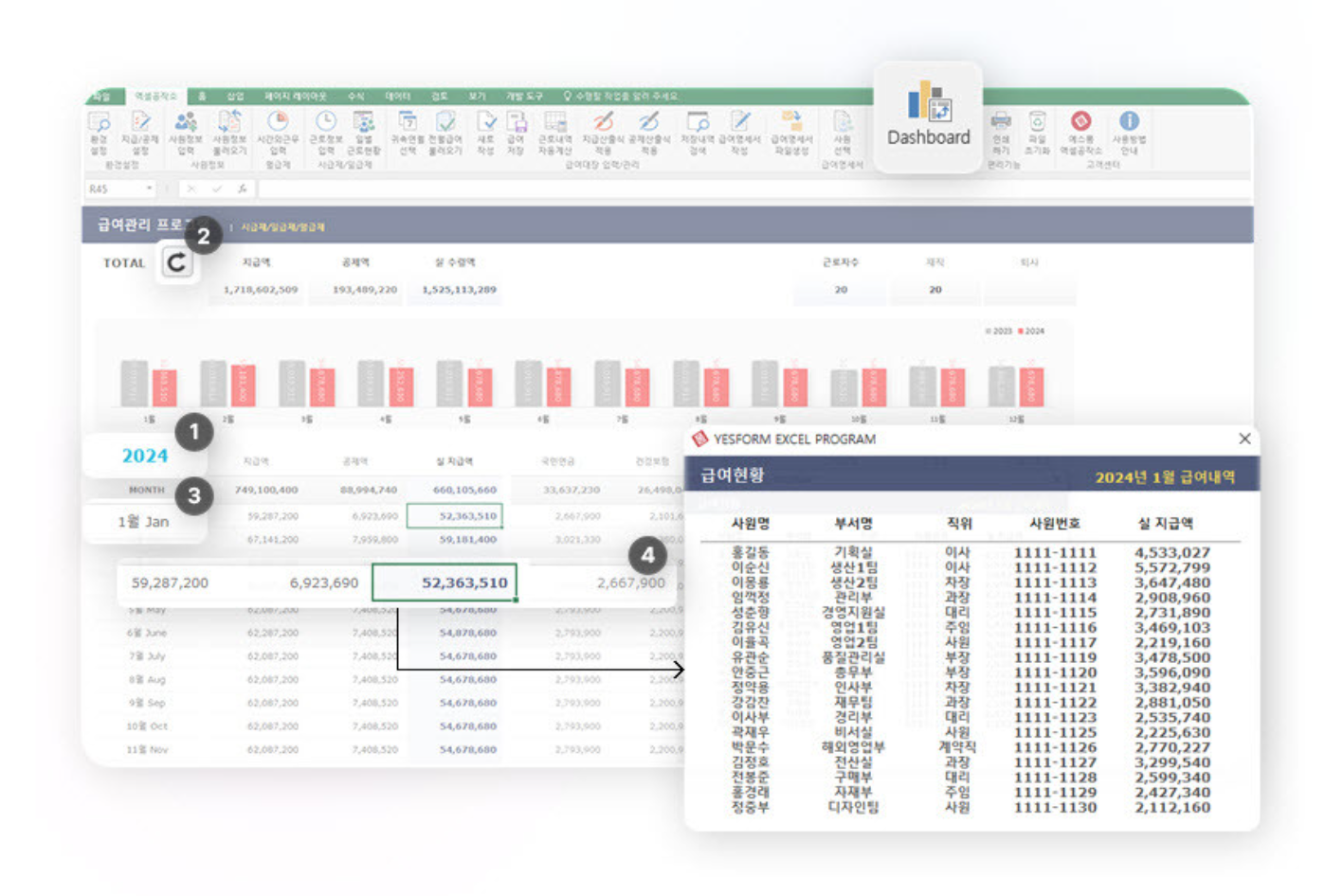 | SHEET 08 | Dashboard | 연간(1월~12월) 급여 차트 제공, 월간 사원별 급여 팝업 제공 |