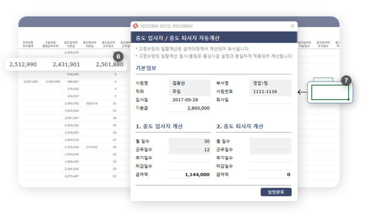 7️⃣ 중도 입/퇴사자 기본급 셀을 더블클릭하면 중도 입/퇴사자 기본급이 작성됩니다.