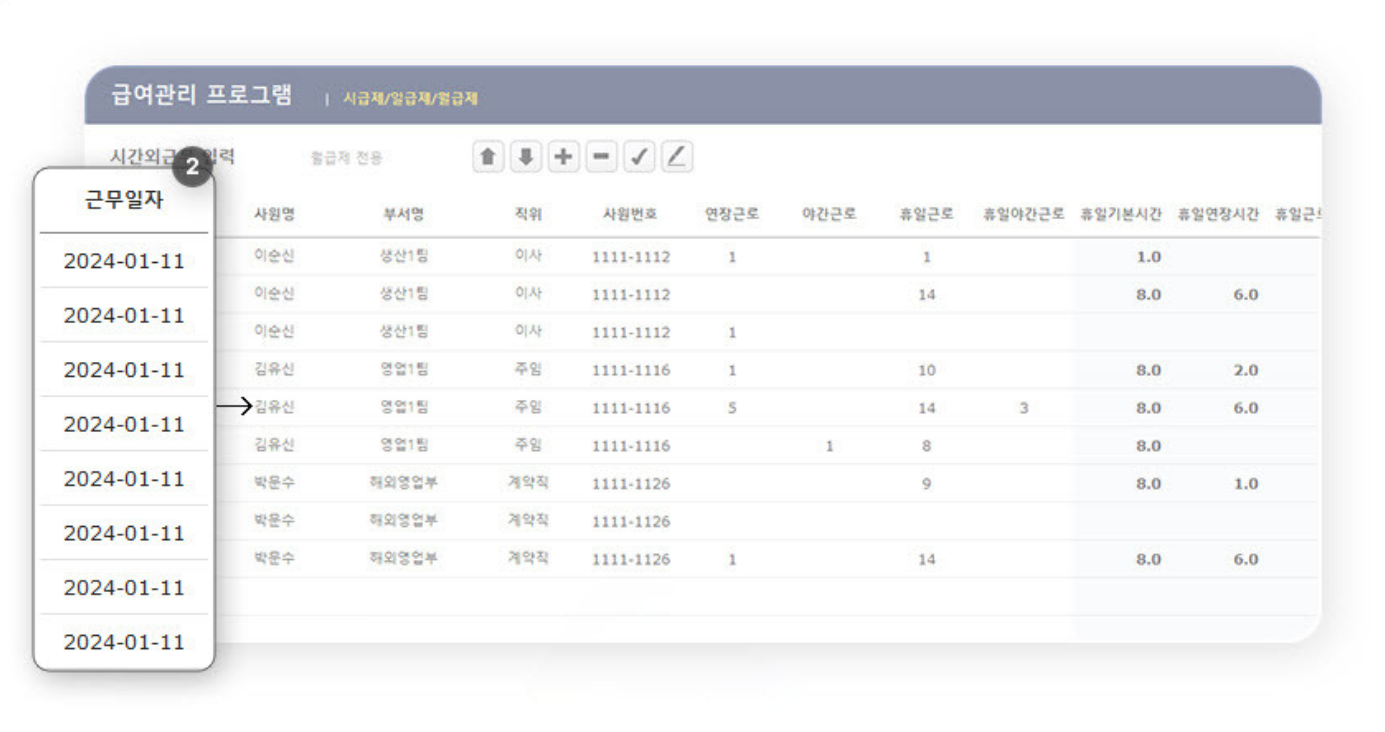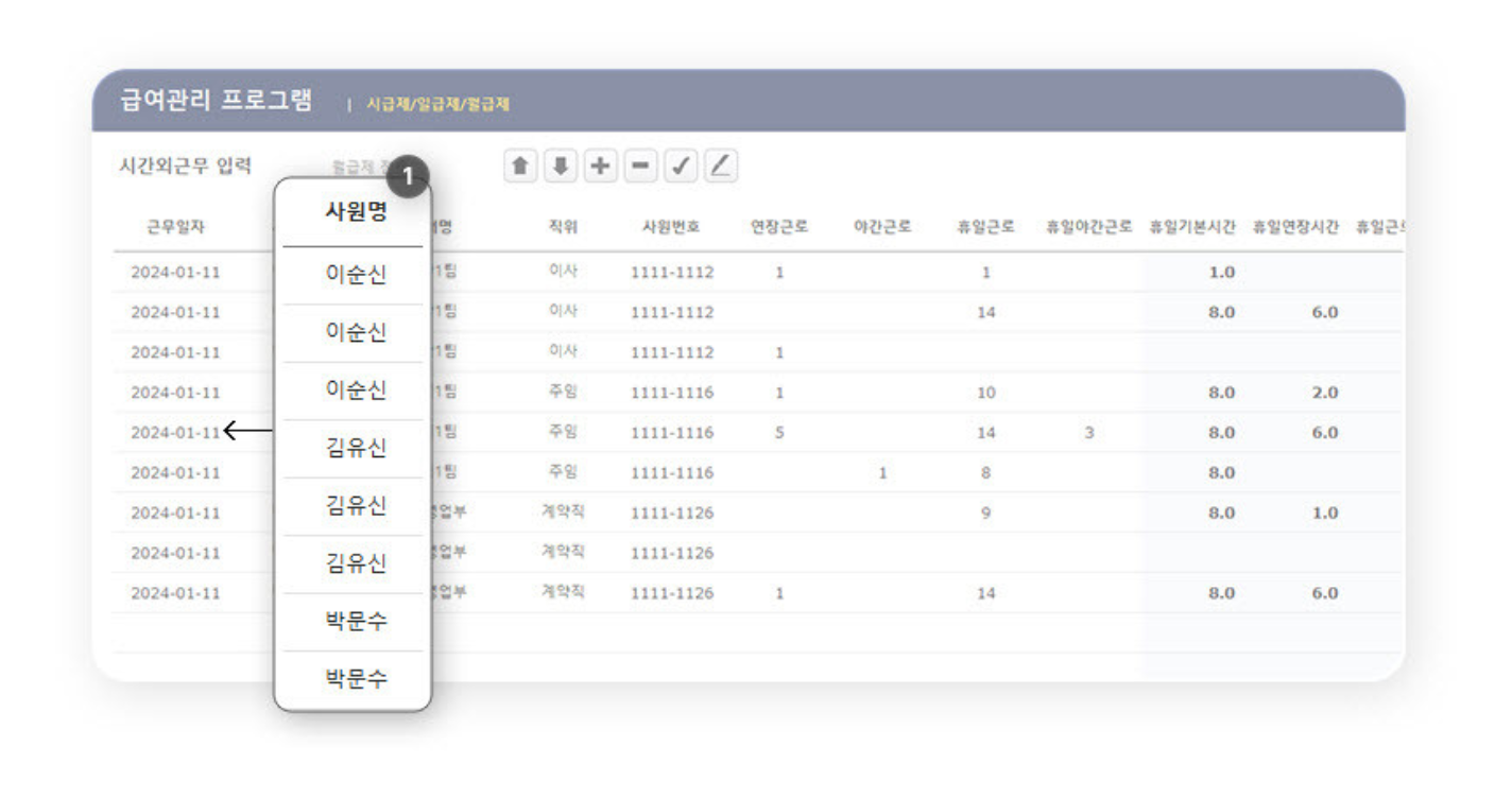 1️⃣ 동일한 일자에 다수 사원명을 선택하여 근무정보 일괄입력 기능을 제공합니다.
