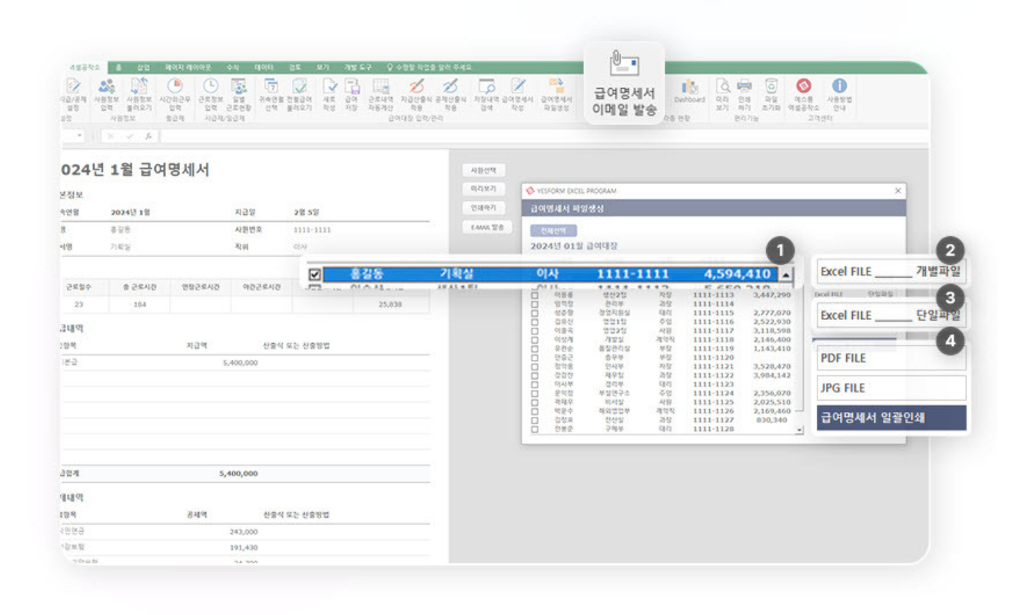 6️⃣ 현재 표시된 급여대장을 급여명세서 파일로 생성합니다.(XLSX, JPG, PDF, 일괄인쇄)