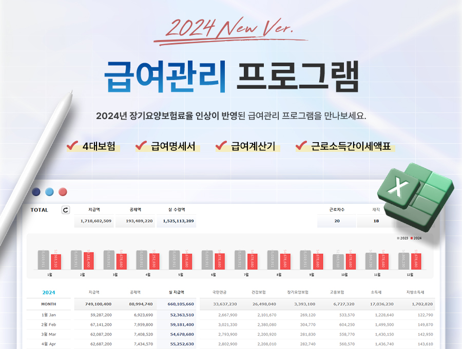 오늘은 예스폼에서 급여계산, 급여관리를 수기로 작성하거나 일반 문서서식을 이용하는 분들을 위해 기본급, 초과근무 수당, 복리후생비 등 다양한 항목을 한 번에 관리할 수 있으며 2024년4대보험요율에 맞춰 업데이트된 예스폼 급여관리엑셀프로그램을 소개드리려 합니다.
