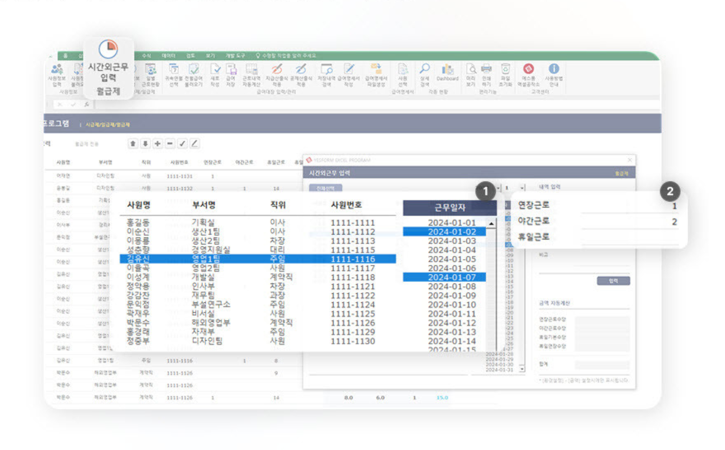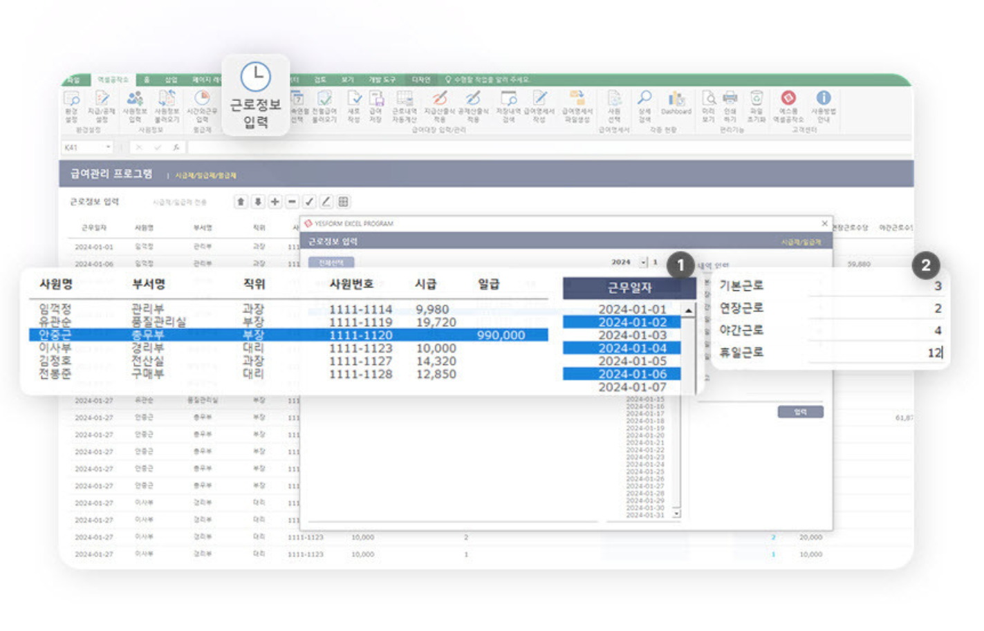 시간외근무(월급제) · 근로정보(시급/일급제) 일괄입력 기능