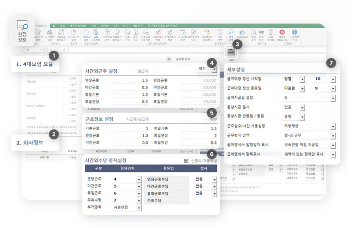 | SHEET 02 | 환경설정 | 환경설정 4대보험요율 및 상/하한액 입력, 회사정보 입력, 공휴일 설정 |