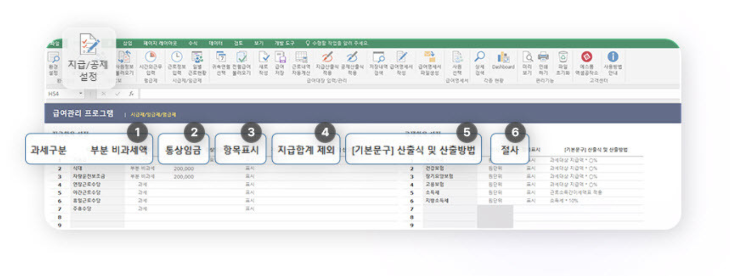 | SHEET 01 | 지급공제 설정 | 지급/공제 항목명, 산출식 입력, 과세구분 · 통상임금 · 항목표시 여부 · 절사단위 설정 |
