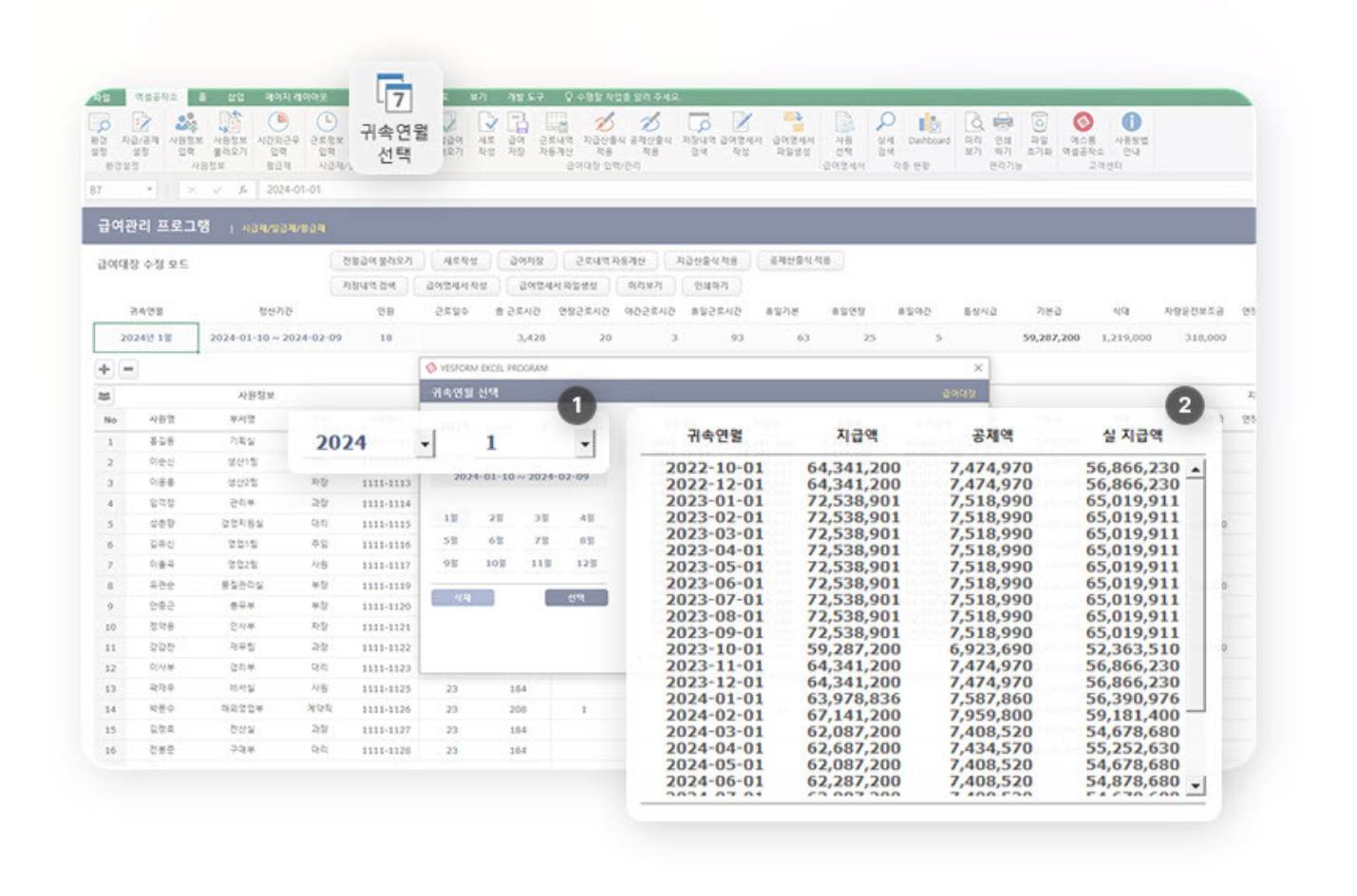 귀속연월별 급여대장 작성 및 관리 기능을 제공하는 시트입니다.