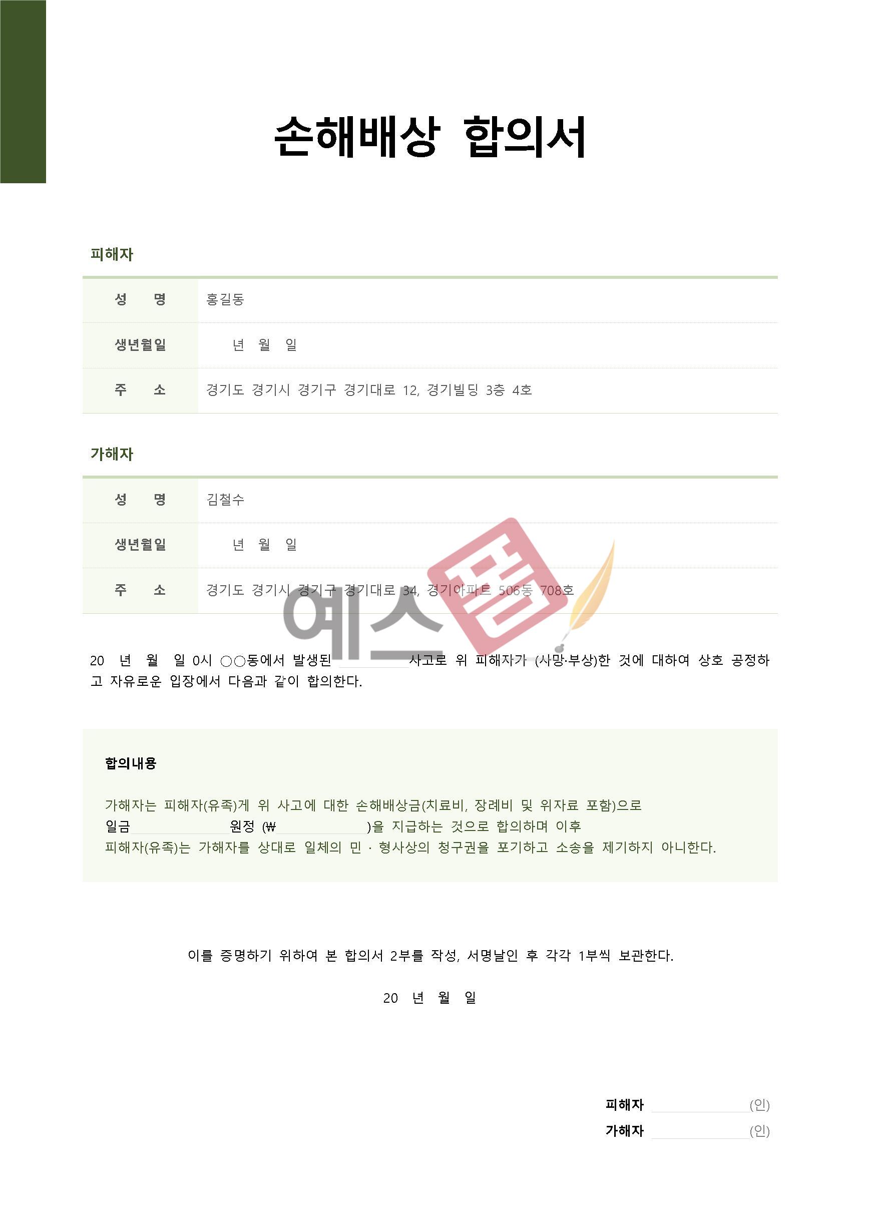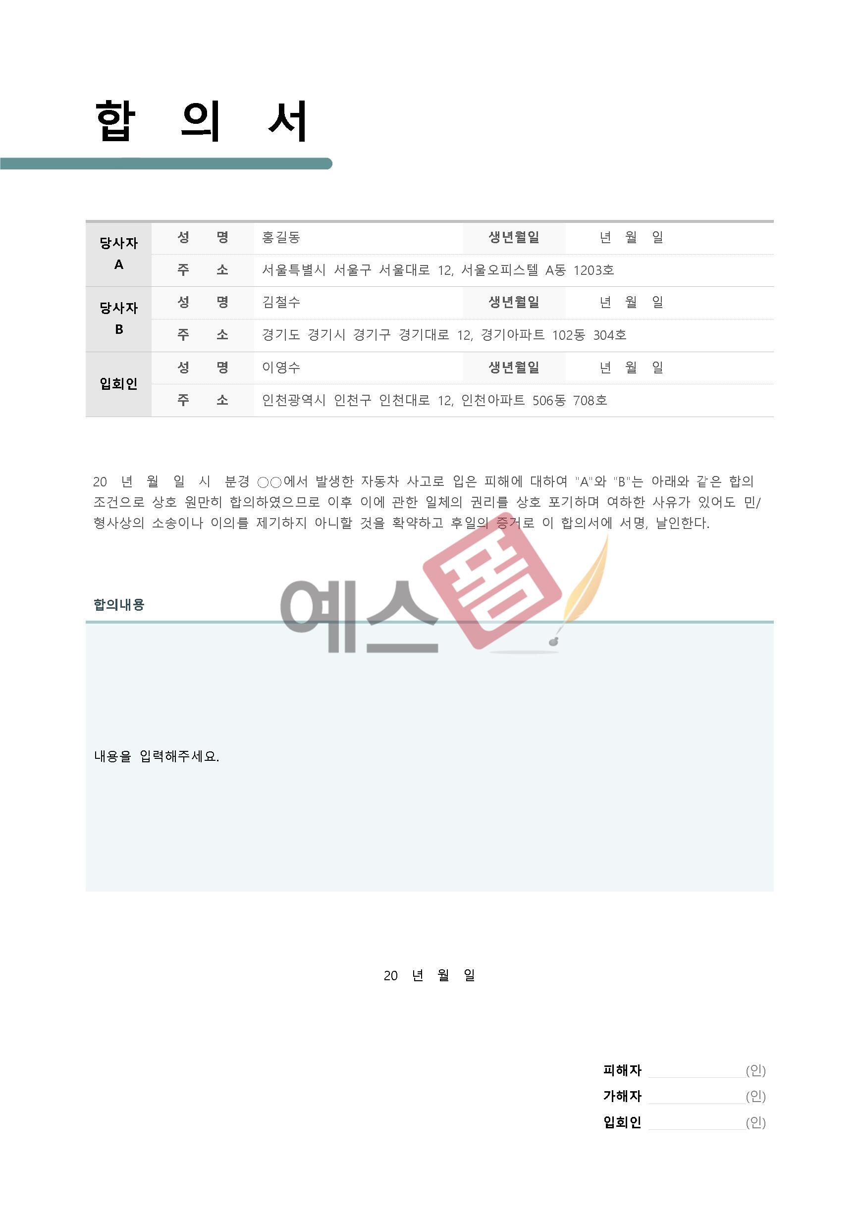 예스폼에서는 다양한 합의서 관련 양식을 서비스하고 있습니다. 공사계약 변경 합의서, 산재 유족보상 합의서, 임금협약 합의서 등 다양한 양식을 활용해 보시기 바랍니다.