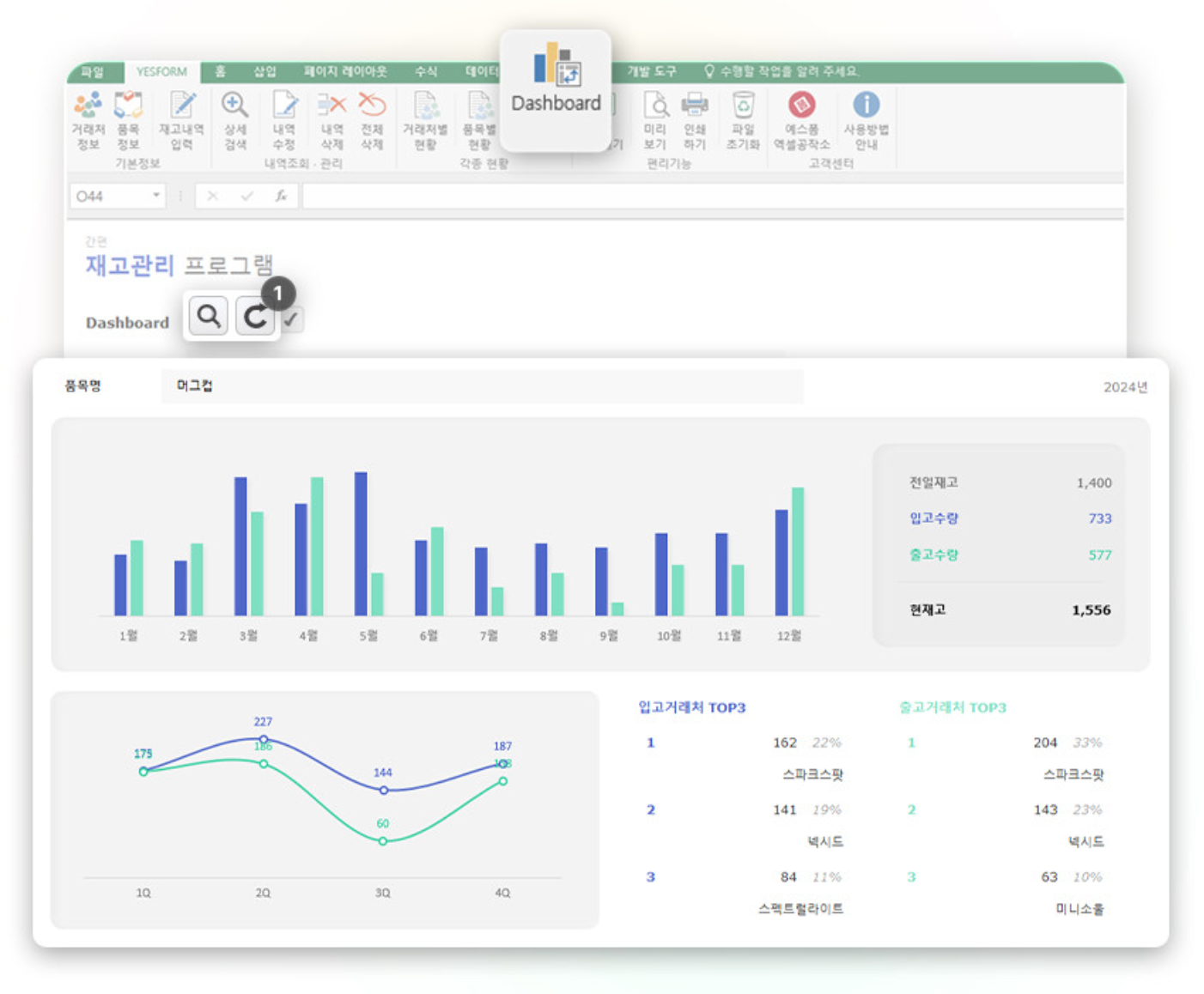 조건별로 재고 현황 검색이 가능하며, 입고/출고 거래처 순위 및 연간 재고 현황 차트와 그래프가 제공됩니다. 새로고침 버튼을 클릭하여 내역을 업데이트할 수 있으며, 입출고 현황을 차트와 함께 직관적으로 확인할 수 있습니다.