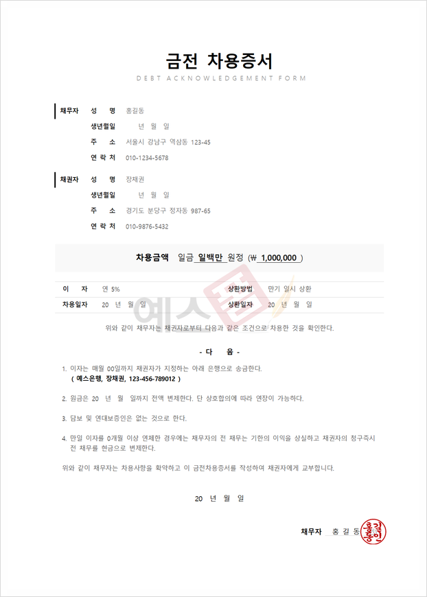 채무자가 채권자로부터 상기 금액을 차용했음을 확인하는 예스폼 금전 차용증서 양식 및 예시입니다.