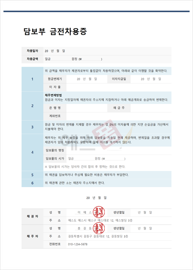 채무자가 채권자로부터 상기 금액을 차용했음을 확인하는 금전 차용증서 양식 및 예시입니다. 채무자와 채권자의 정보가 기재되어 있으며, 차용금액, 이자율, 상환방법, 차용일자, 상환일자 등