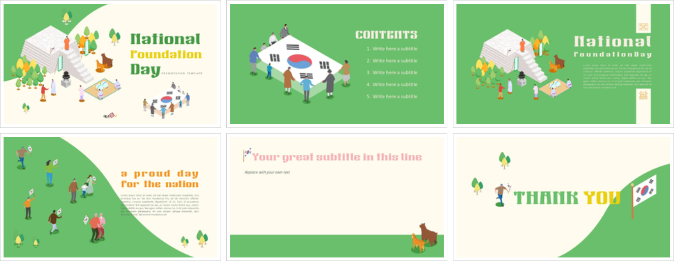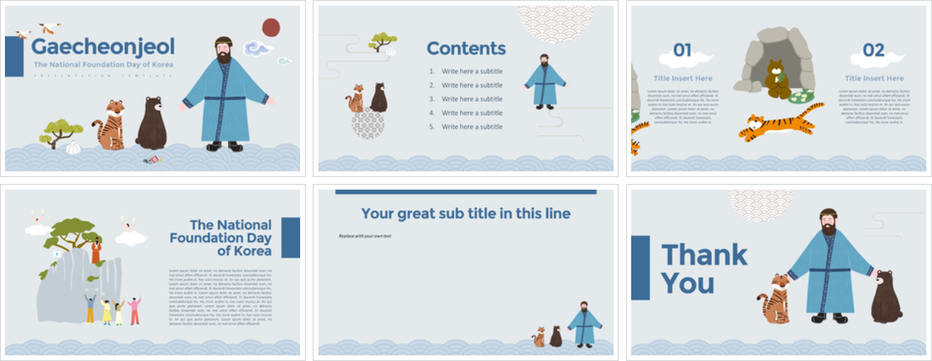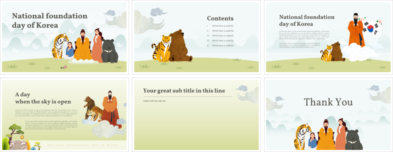개천절을 테마로 제작된 일러스트 배경 템플릿입니다. 한국, 역사 관련 자료에 추천드리는 템플릿입니다. 6장의 슬라이드로 표지, 목차, 내지, 종지로 서비스 되고 있습니다.