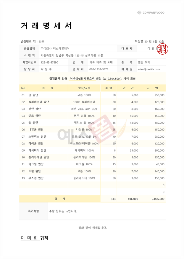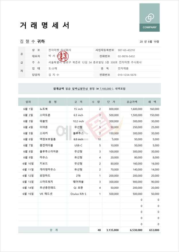 거래 양측이 거래 내역을 명확하게 확인하고, 결제 및 납품을 원활하게 진행할 수 있게 하는 거래명세서 양식입니다.