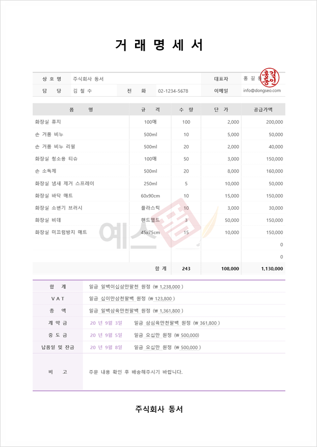 부가세가 포함된 경우, 부가세 항목도 별도로 기재합니다.