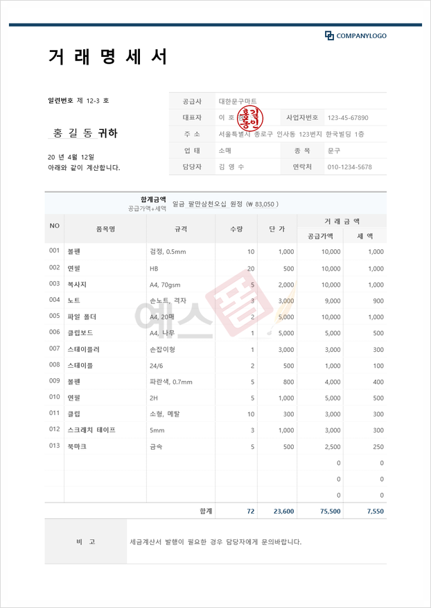 거래의 세부 내역을 기록하여 거래를 확인하고 세금을 정확하게 계산할 수 있는 거래명세서 양식입니다.