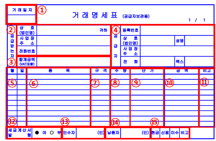 거래명세서는 일반적으로 공급자, 공급받는자용 총 두 장을 발급해야 합니다. 앞장은 공급받는자용(파랑), 뒷장은 공급자용(빨강)이므로 구분하여 발행하도록 합니다. 두 장이 한 세트이므로 공급자가 매출을 신고하지 않아도 공급받는자가 세액공제를 받기 위해 매입 신고를 하게 되는데, 이때 상호 검증기능을 발휘하게 됩니다.