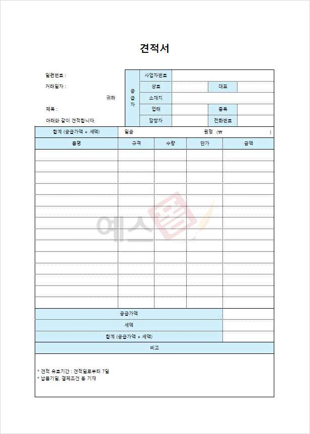 견적서를 작성하여 제출함과 동시에 계약이 성립되는 것이므로 가능한 표준 용어로 작성하여 신뢰감을 주도록 합니다.
