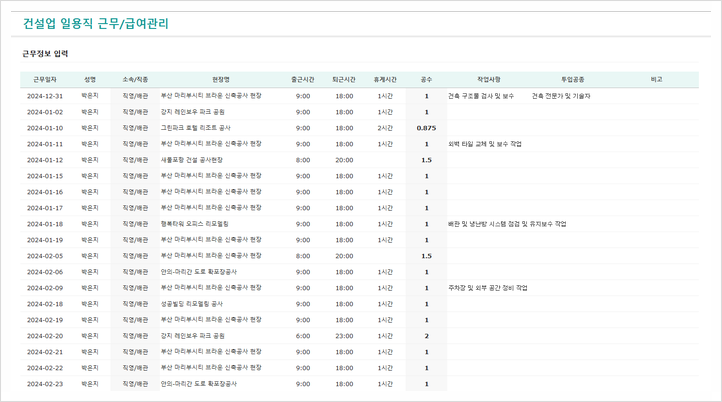 근무자별 근무 일자, 성명, 현장명, 출 · 퇴근시간, 휴게시간 입력 시 공수가 자동으로 계산됩니다.