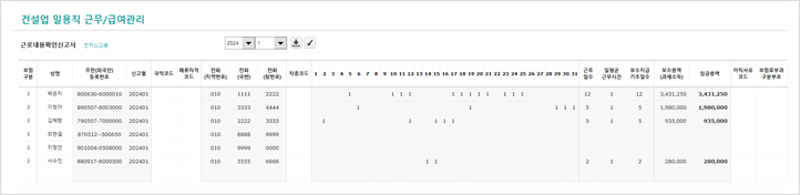 건설업 일용직 근무자의 현장별 출근정보와 급여정보를 입력하여 일용노무비 지급명세서, 일용근로소득 지급명세서, 근로내용 확인신고서[전자신고용], 근무현황 차트를 산출할 수 있는 건설