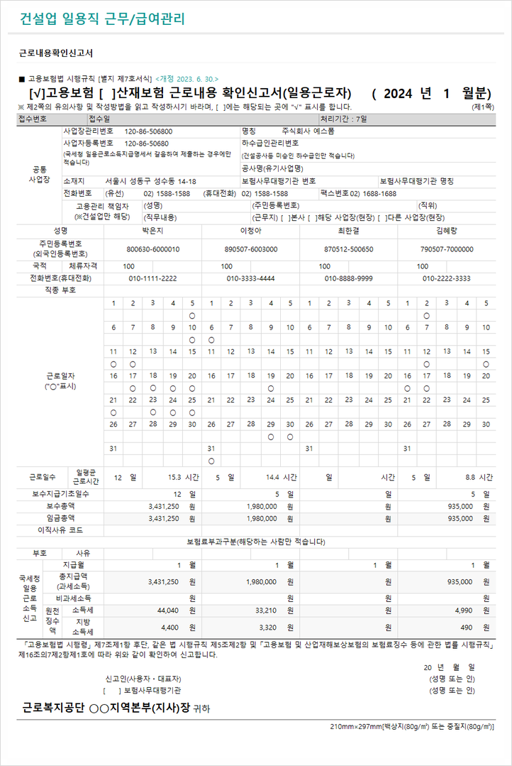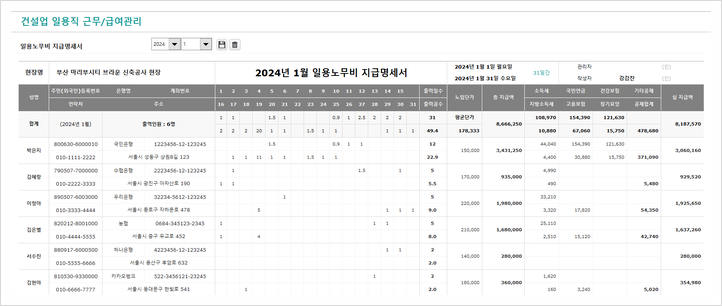 건설업 일용직 근무자의 현장별 출근정보와 급여정보를 입력하여 일용노무비 지급명세서, 일용근로소득 지급명세서, 근로내용 확인신고서[전자신고용], 근무현황 차트를 산출할 수 있는 건설