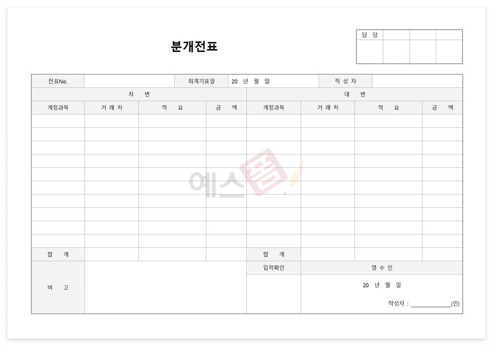 분개전표는 기업활동에 따라 자산, 부채, 자본이 증감하거나 수익, 비용이 발생 또는 소멸하는 거래를 차변과 대변으로 나누어 기록하는 서식으로 일정 기간 동안의 거래 내용을 요약 정리한 표