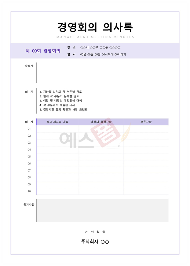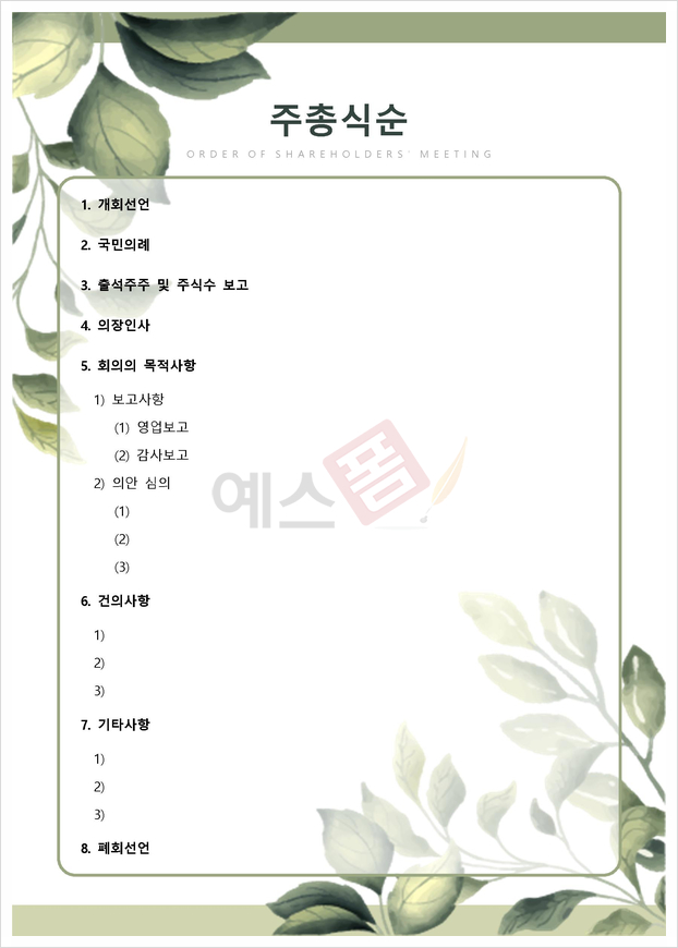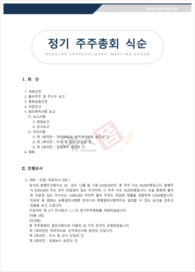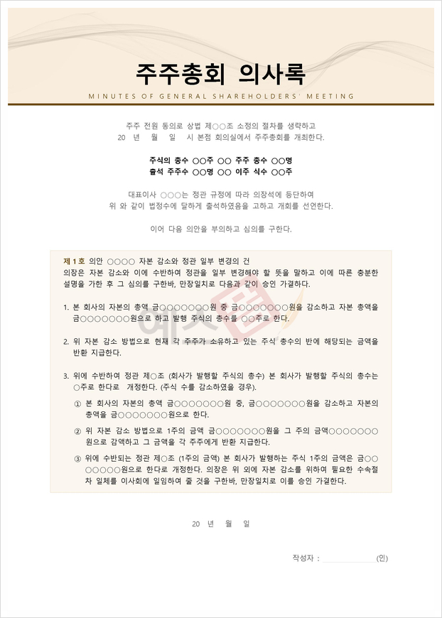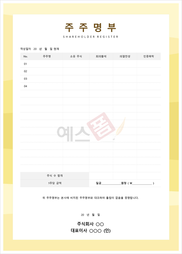 주주들의 의견을 듣고 이를 회사 경영에 반영하기 위해 주주총회, 정기총회 등을 개최할 때 활용하기 좋은 양식입니다. 주주명부를 비롯하여 식순, 회의록, 의사록 양식으로 주주 친화적인 경영을 실천해보시기 바랍니다.