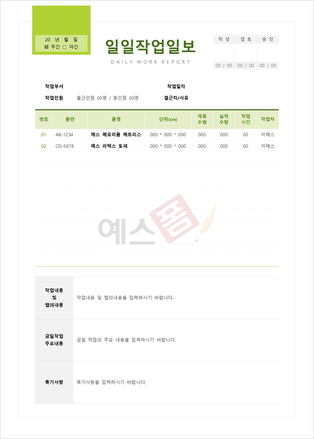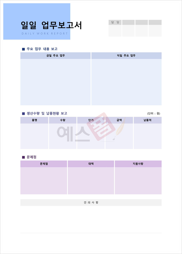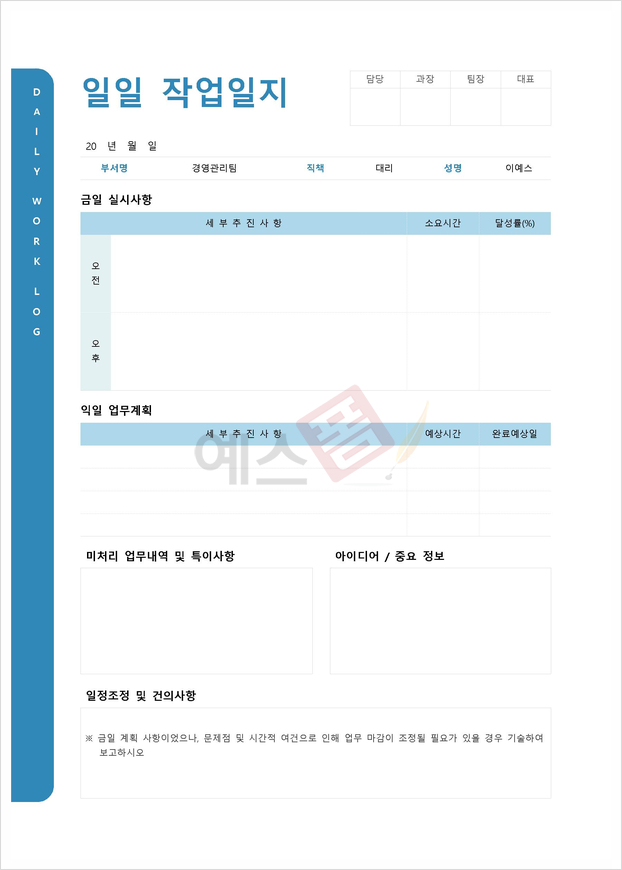 회사의 일일 업무를 보고하기 위한 보고서입니다. 금일 수행한 주요 업무와 익일 업무계획, 팀별 협조사항 및 건의사항, 지시사항 등을 기재하실 수 있습니다.