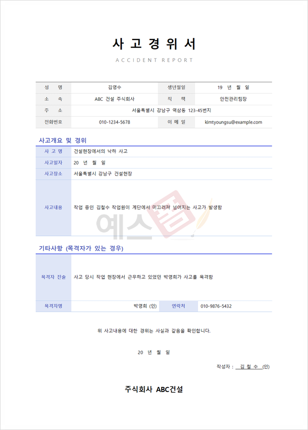 예스폼 사고경위서 양식을 통해서 건설현장에서 발생한 사고를 상세히 보고할 수 있는데요. 사고명과 사고일자, 사고장소, 사고내용 등을 자세하게 작성해 보실 수 있으며, 목격자가 있는 경우에 활용이 가능하도록 목격자 진술칸도 기재되어 있습니다. 특정 현장에서 발생한 사고 내용이 예시로 포함되어 있으니 참고하여 작성해 보시면 좋을 것 같습니다.