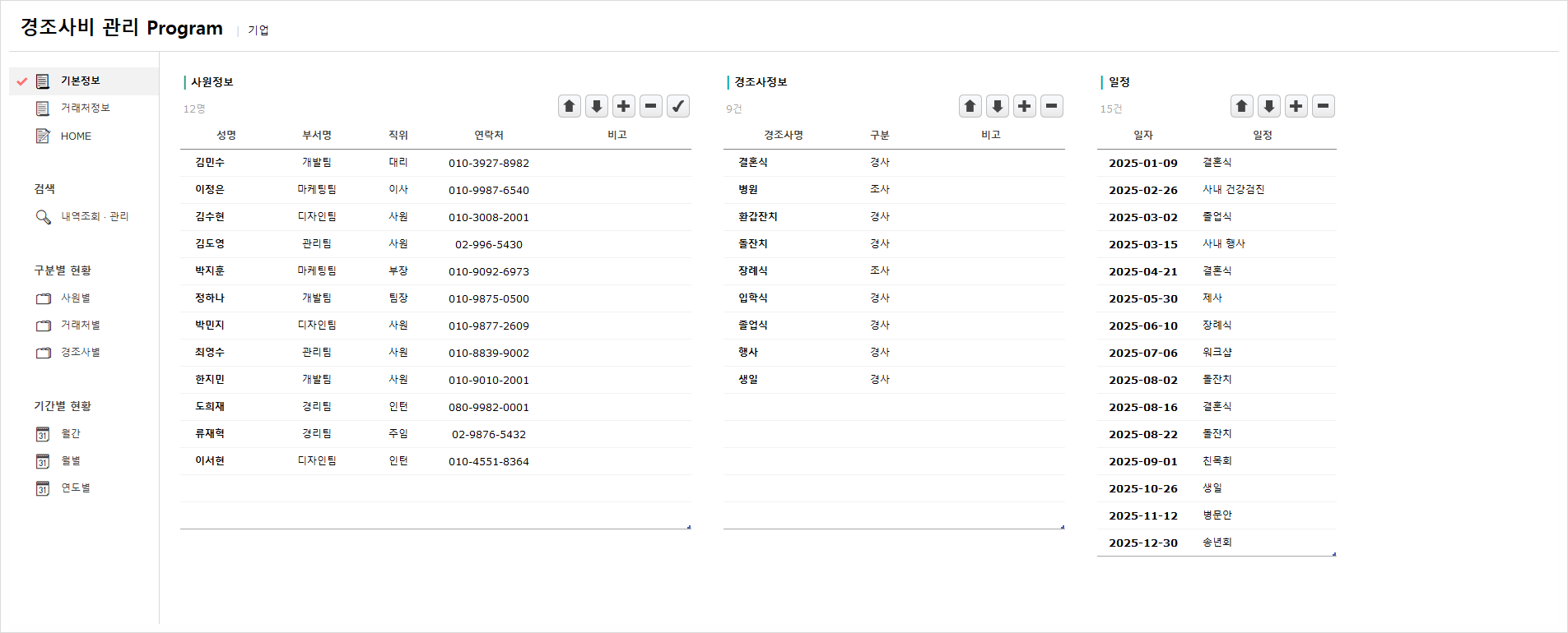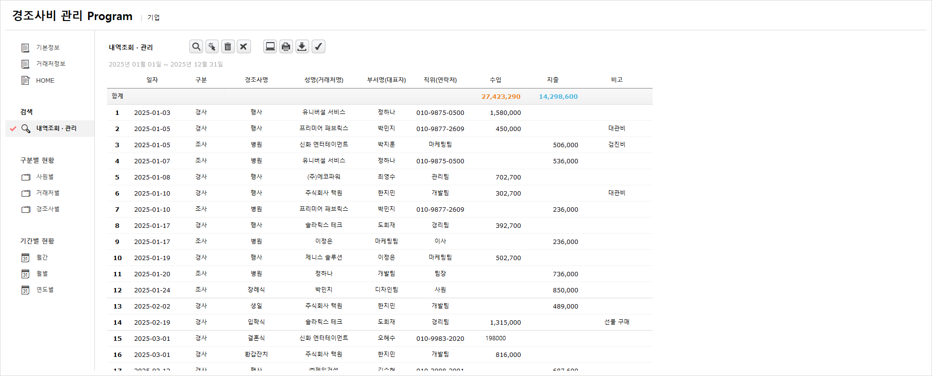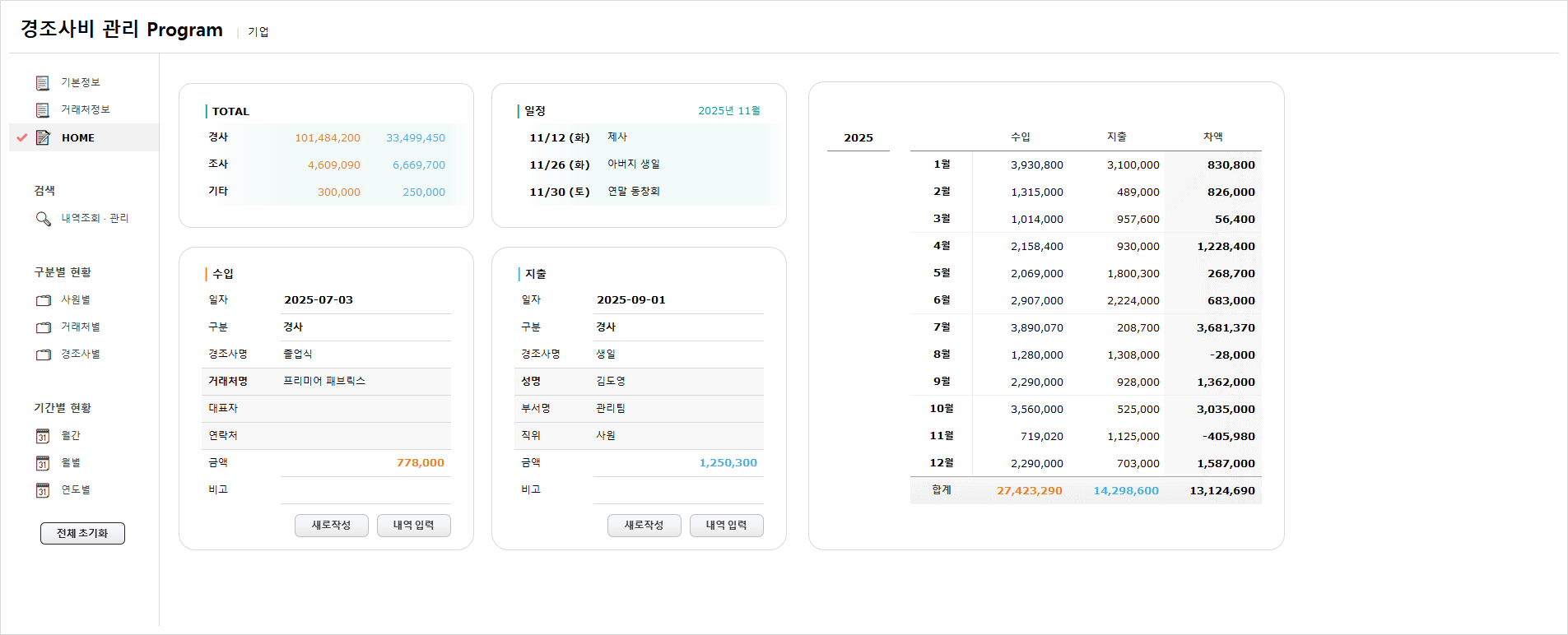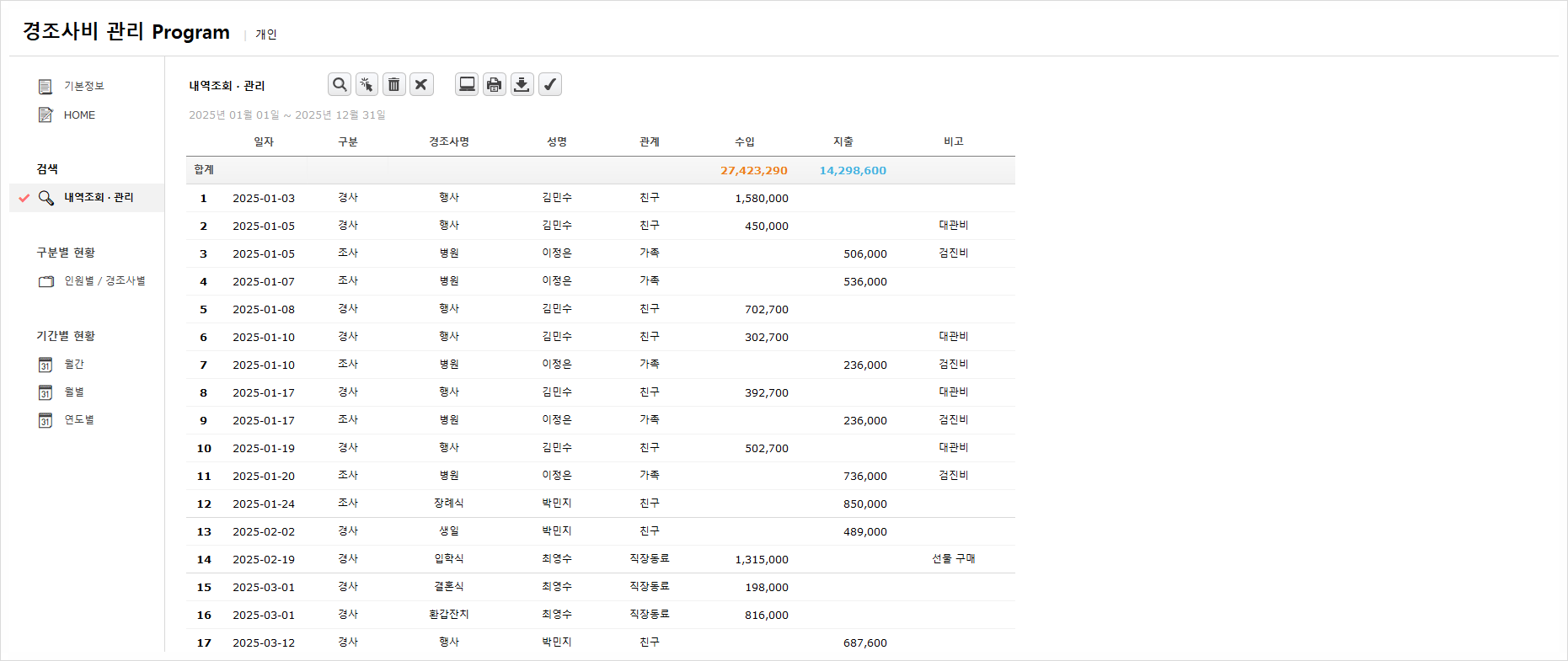 기업에서 경조사비를 관리하는 프로그램으로 직원별 경조사비 지급내역을 입력하여 검색, 수정 등 다양하게 관리하실 수 있고, 각종 통계기능을 이용하여 보다 편리하게 이용하실 수 있습니다.