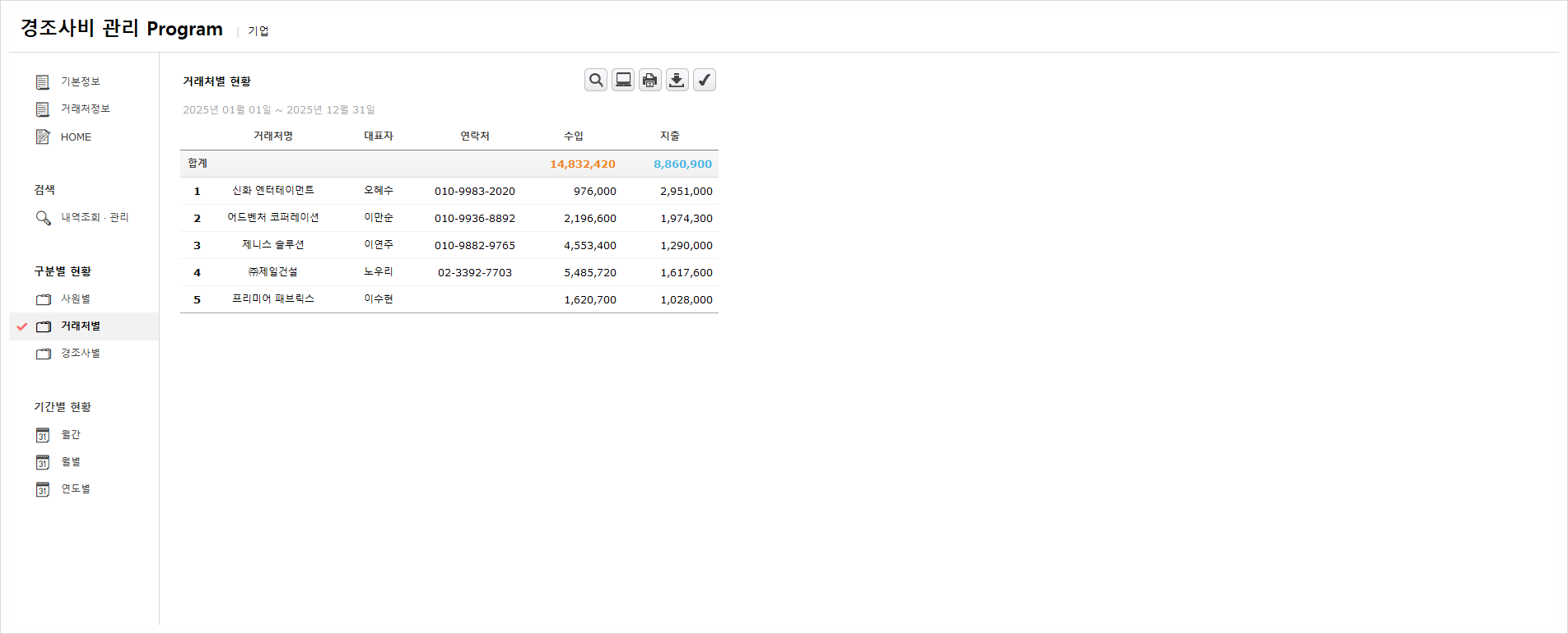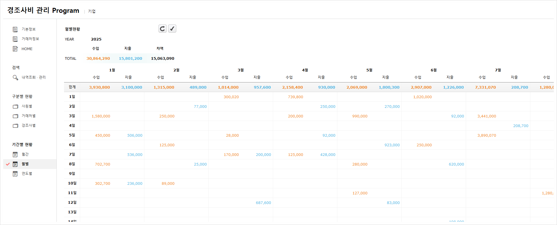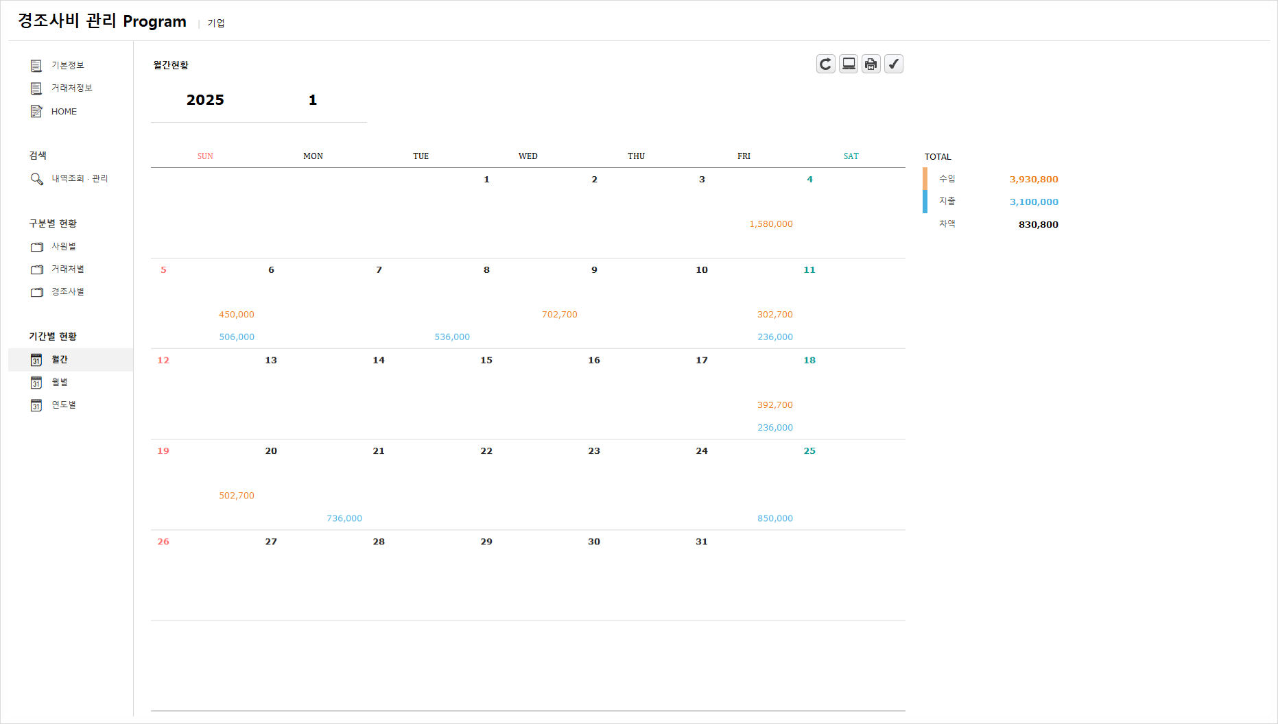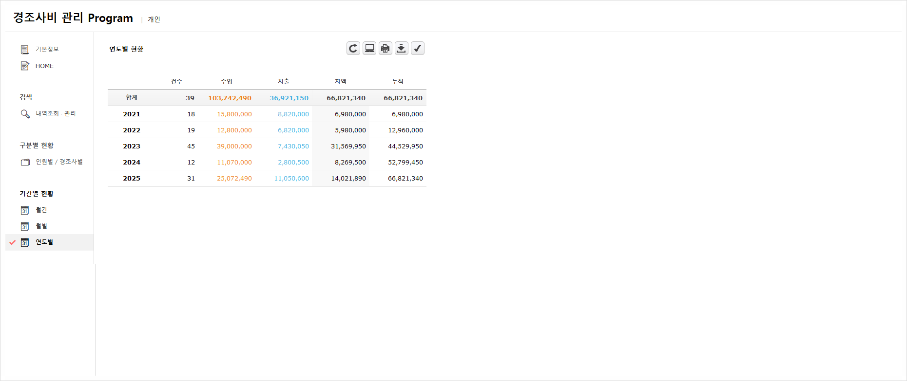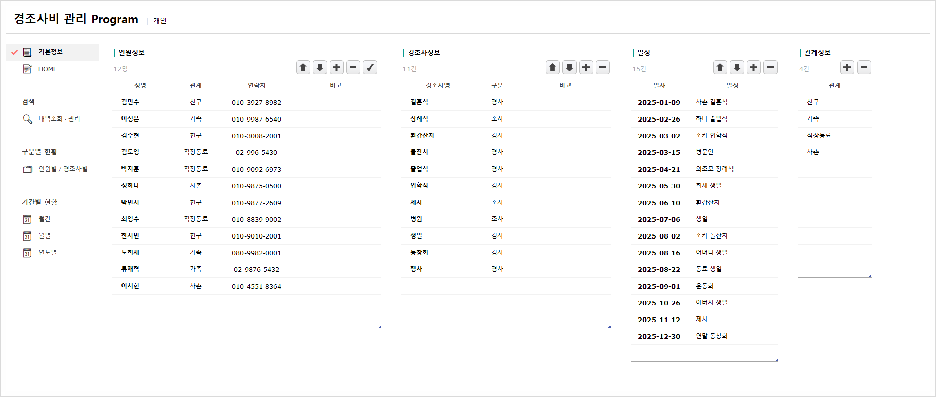 기업에서 경조사비를 관리하는 프로그램으로 직원별 경조사비 지급내역을 입력하여 검색, 수정 등 다양하게 관리하실 수 있고, 각종 통계기능을 이용하여 보다 편리하게 이용하실 수 있습니다.