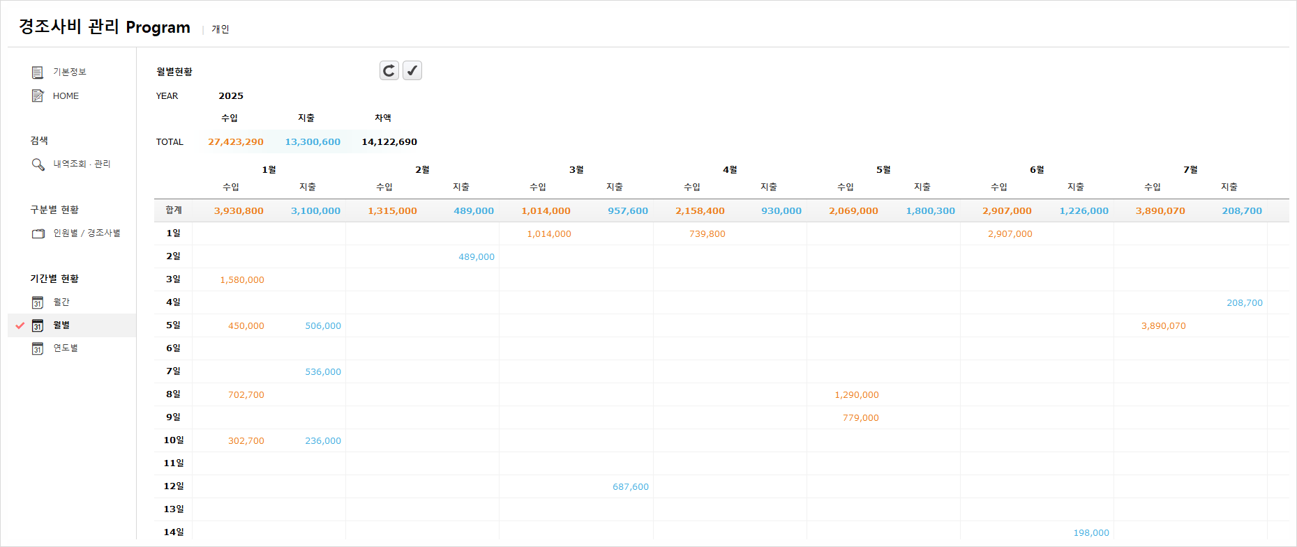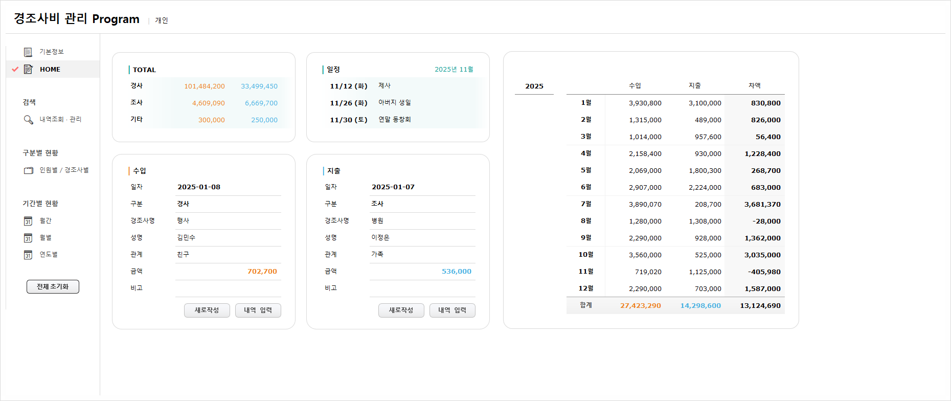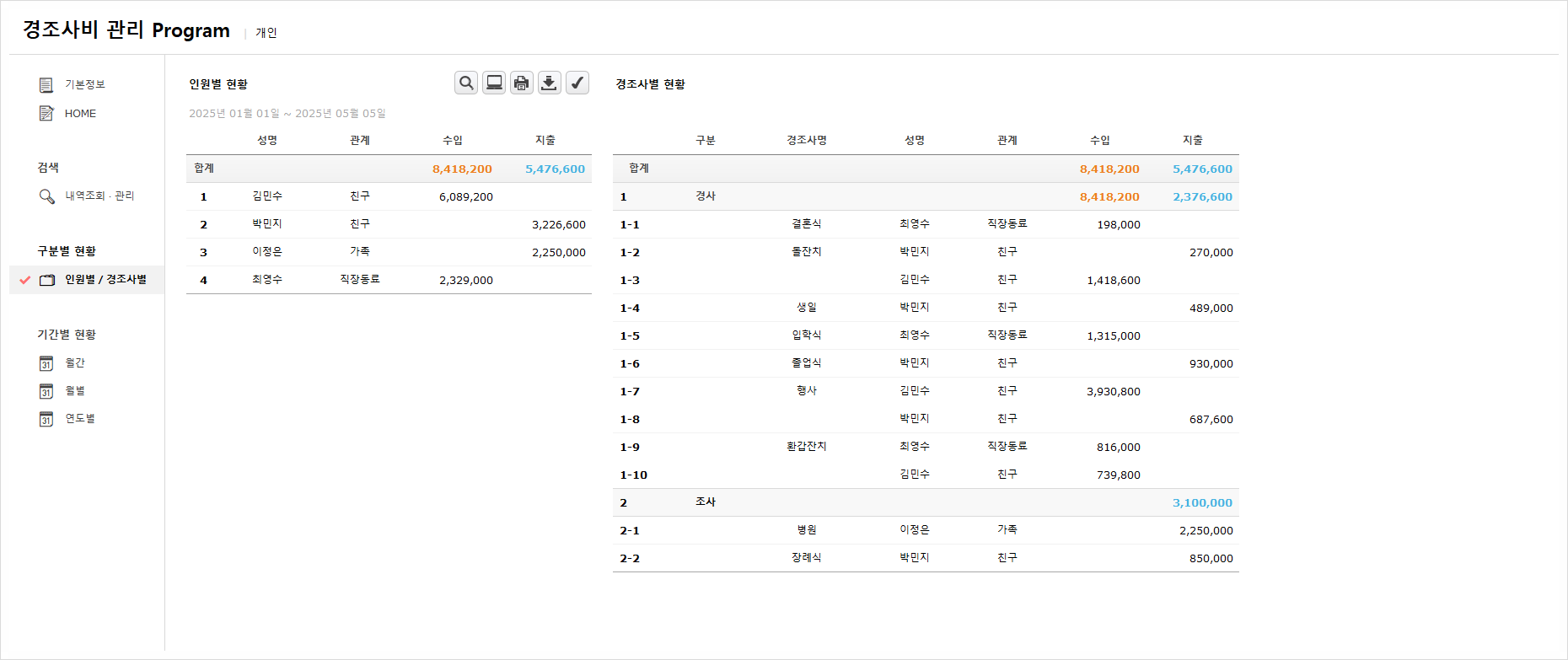 업그레이드 된 기능을 통해 당월 경조사 일정을 실시간으로 조회할 수 있으며 각종 경조사 수입/지출내역을 관리할 수 있습니다. 인원별 사용내역 입력이 가능하며, 일자 · 사용자 등 각종 설정
