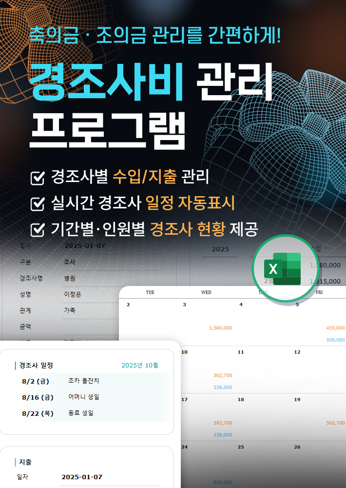 이번 포스팅에서는 경조사비 뜻과 법인 경조사비 한도에 대해 정리하고, 경조사비를 스마트하게 관리할 수 있는 개인용·기업용 경조사비 엑셀 프로그램 양식까지 함께 소개해 드리겠습니다.