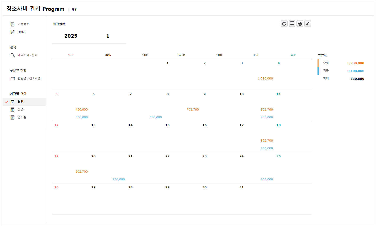 업그레이드 된 기능을 통해 당월 경조사 일정을 실시간으로 조회할 수 있으며 각종 경조사 수입/지출내역을 관리할 수 있습니다. 인원별 사용내역 입력이 가능하며, 일자 · 사용자 등 각종 설정