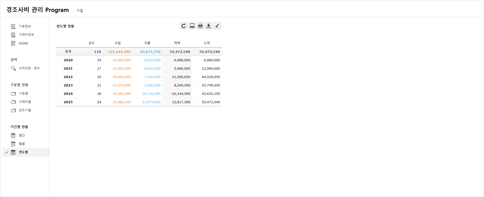 기업에서 경조사비를 관리하는 프로그램으로 직원별 경조사비 지급내역을 입력하여 검색, 수정 등 다양하게 관리하실 수 있고, 각종 통계기능을 이용하여 보다 편리하게 이용하실 수 있습니다.
