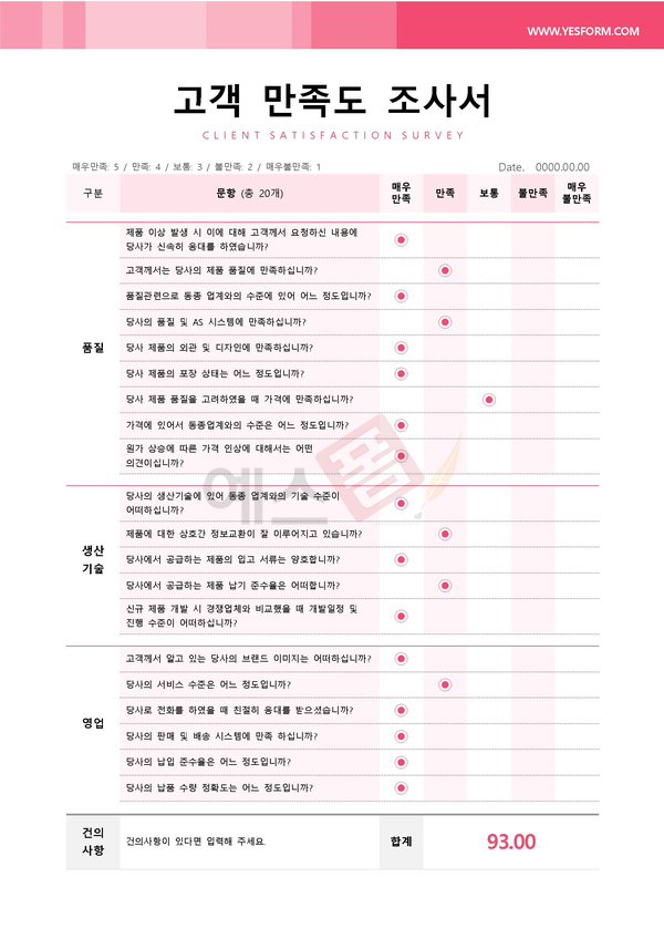 고객 만족도 조사를 진행할 때 직접 양식을 제작하는 것이 어렵게 느껴지시는 분들께서는 예스폼의 고객 만족도 조사서 양식을 사용하여 진행해 보시기 바랍니다.