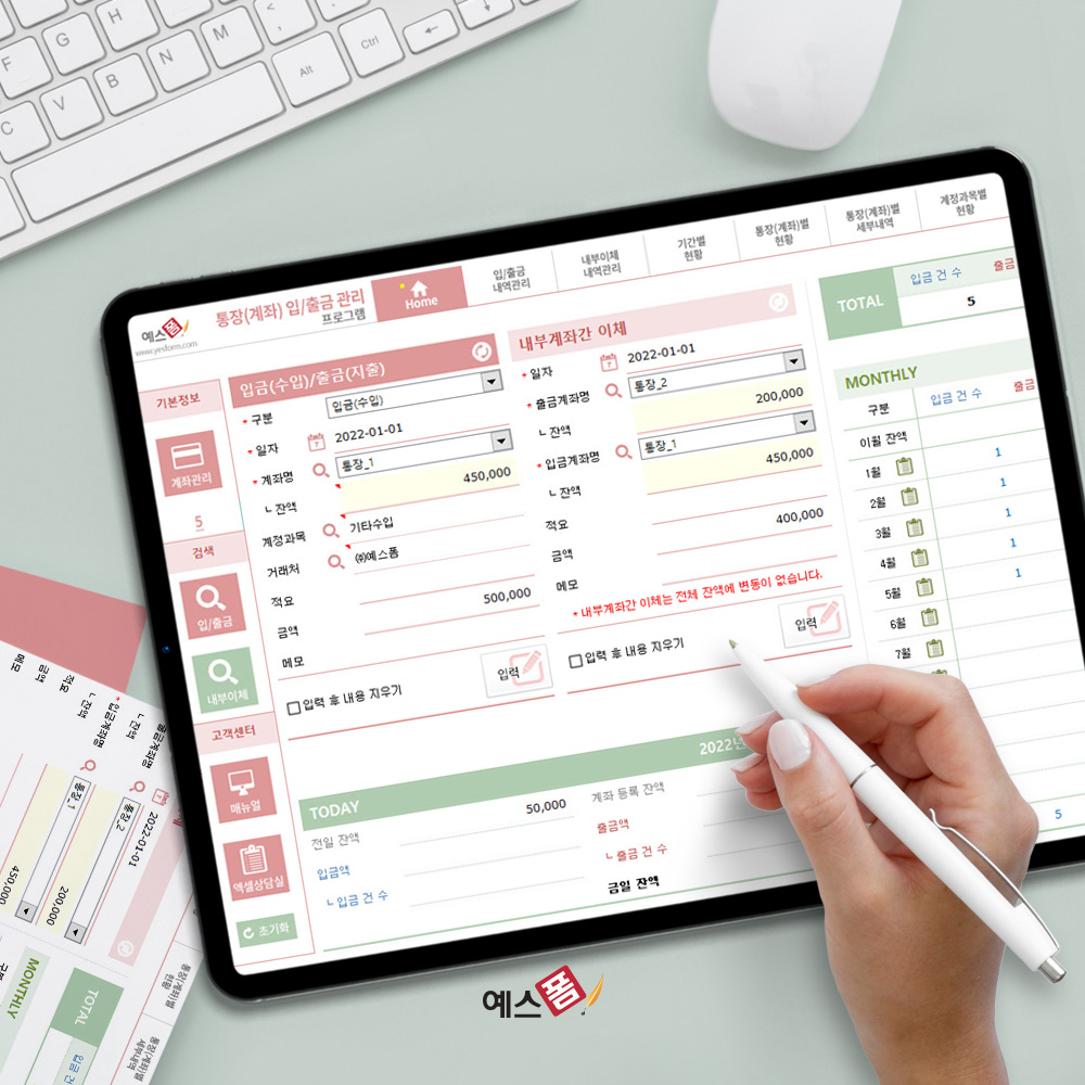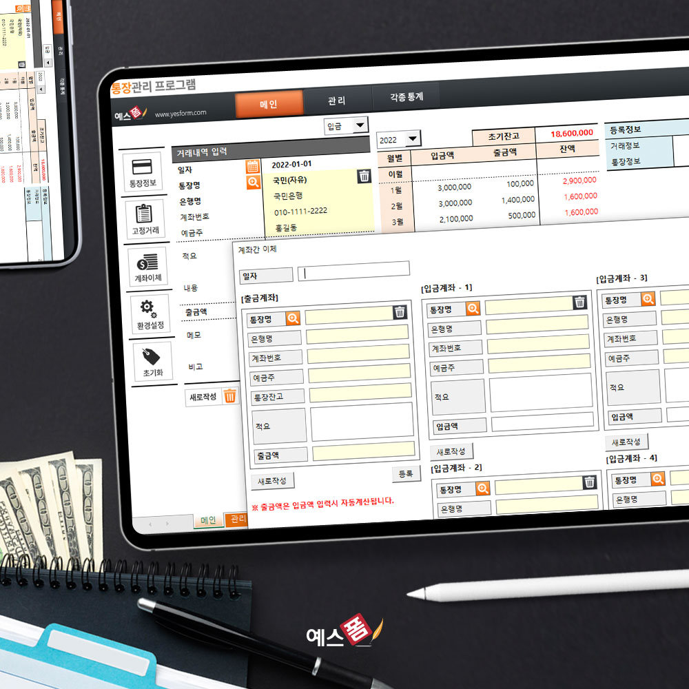 파킹통장 뿐만 아닌, 가지고 있는 각종 예/적금 통장이 늘어나게 되면 통장 관리의 필요성을 느끼게 되는데, 예스폼에서는 회사 또는 개인이 가지고 있는 통장의 입출금 내역을 간편하게 관리할 수 있고, 고정 거래와 계좌 간 이체 기능을 가지고 있어 보다 효율적인 관리가 가능한 '통장관리 프로그램'을 받아 보실 수 있습니다. 다양한 관리 기능과 통계를 통해 잔액을 한눈에 확인할 수 있는 시스템을 통해 체계적으로 관리해보시기 바랍니다.