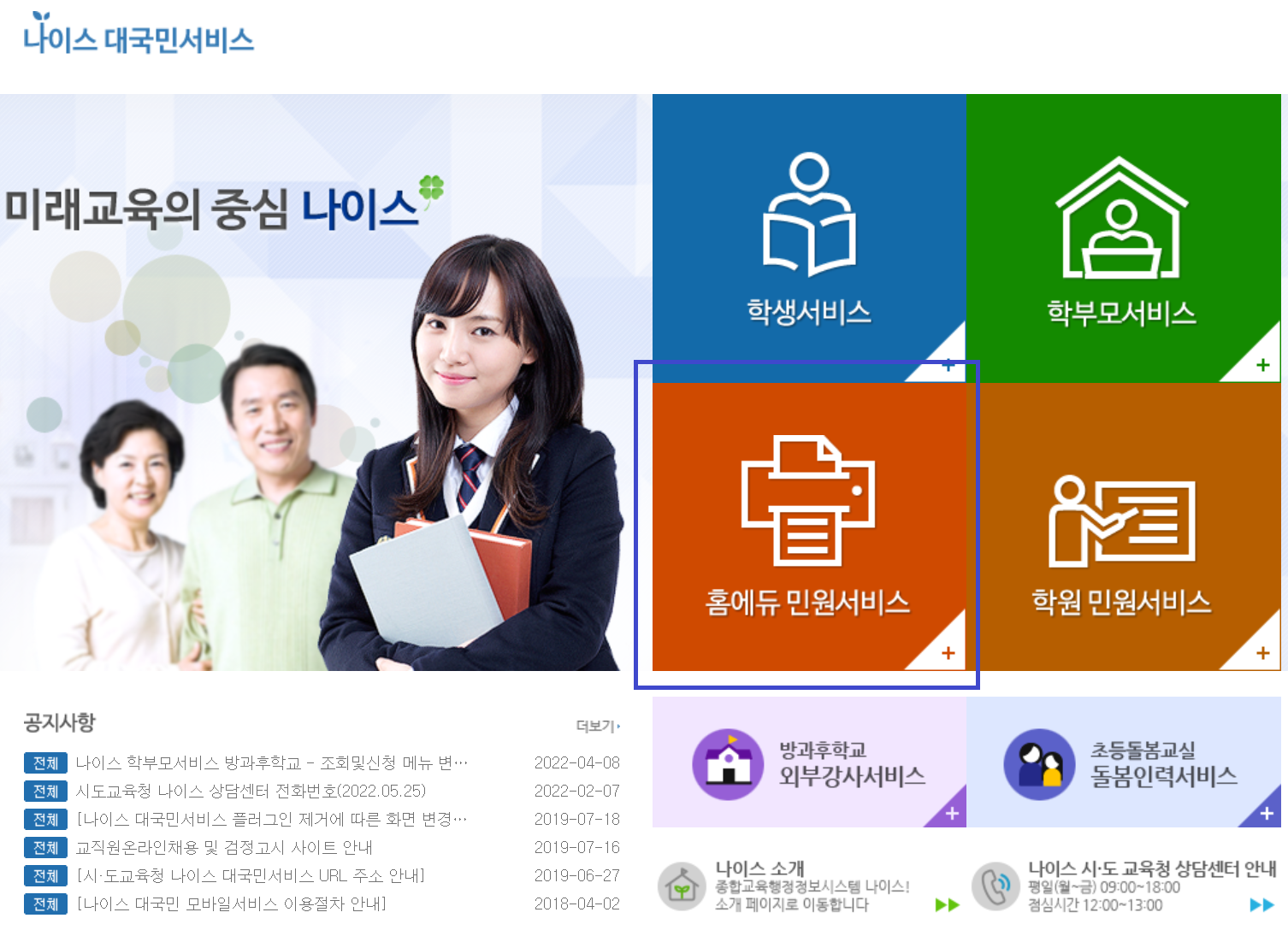 1. 나이스 대국민서비스 홈페이지(https://homedu.use.go.kr/pas_mms_nv99_001.do)에 접속하여 홈에듀 민원서비스를 클릭합니다.