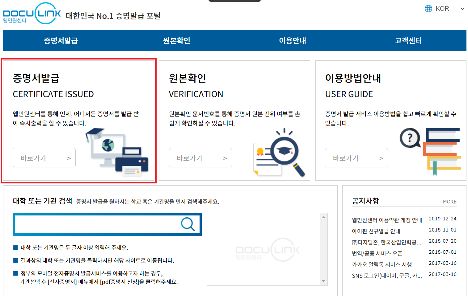 대학교에서 발급하는 각종 증명서를 신청하실 수 있는 사이트입니다. 정부24와 달리 온라인으로 신청하여 프린터로 바로 발급받으실 수 있지만, 대행수수료가 별도로 부과되고 일부 대학은 서비스를 지원하지 않아 졸업증명서를 신청하지 못하는 경우도 있습니다.