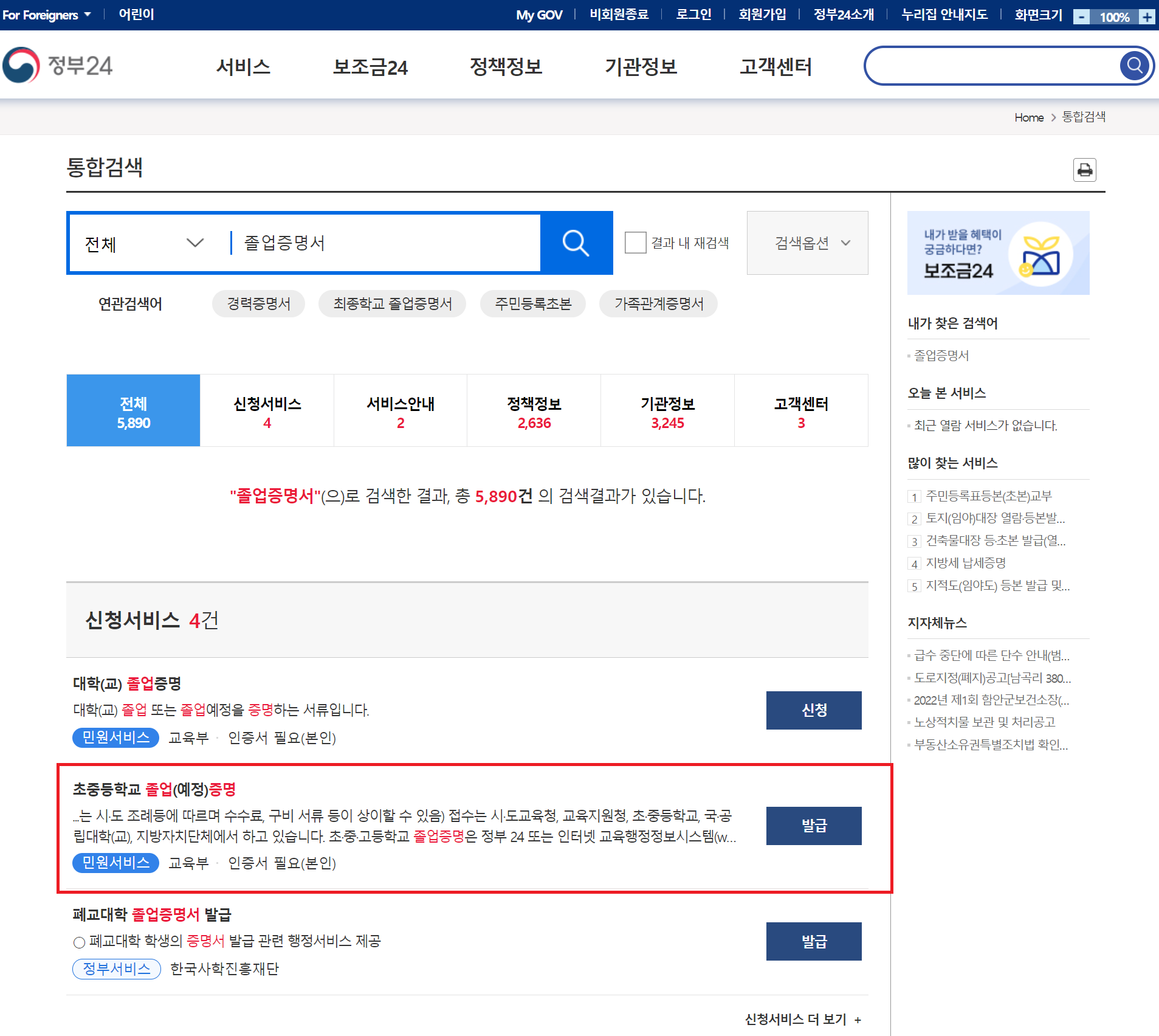 1. 정부24 홈페이지에서 졸업증명서를 검색한 후 "초중등학교 졸업(예정)증명" 발급을 클릭합니다.