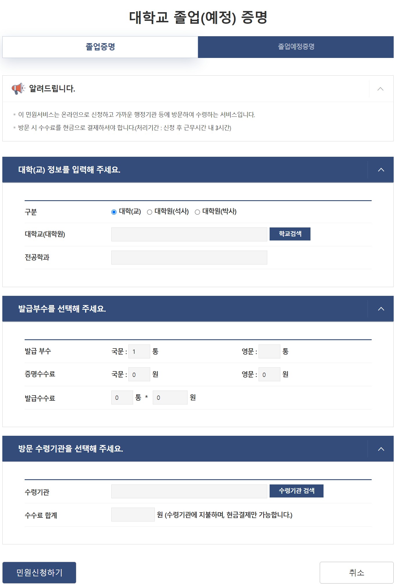 | 대학증명발급 웹민원센터 | 온라인 발급 가능 | 지원 안하는 대학도 있음 | |
