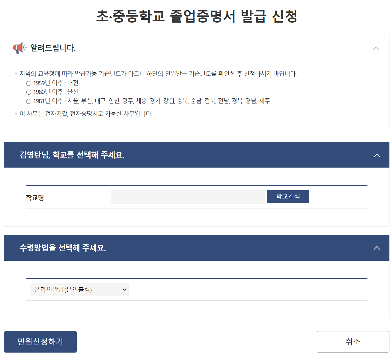 2. 내가 졸업한 학교와 발급방법을 선택합니다.
