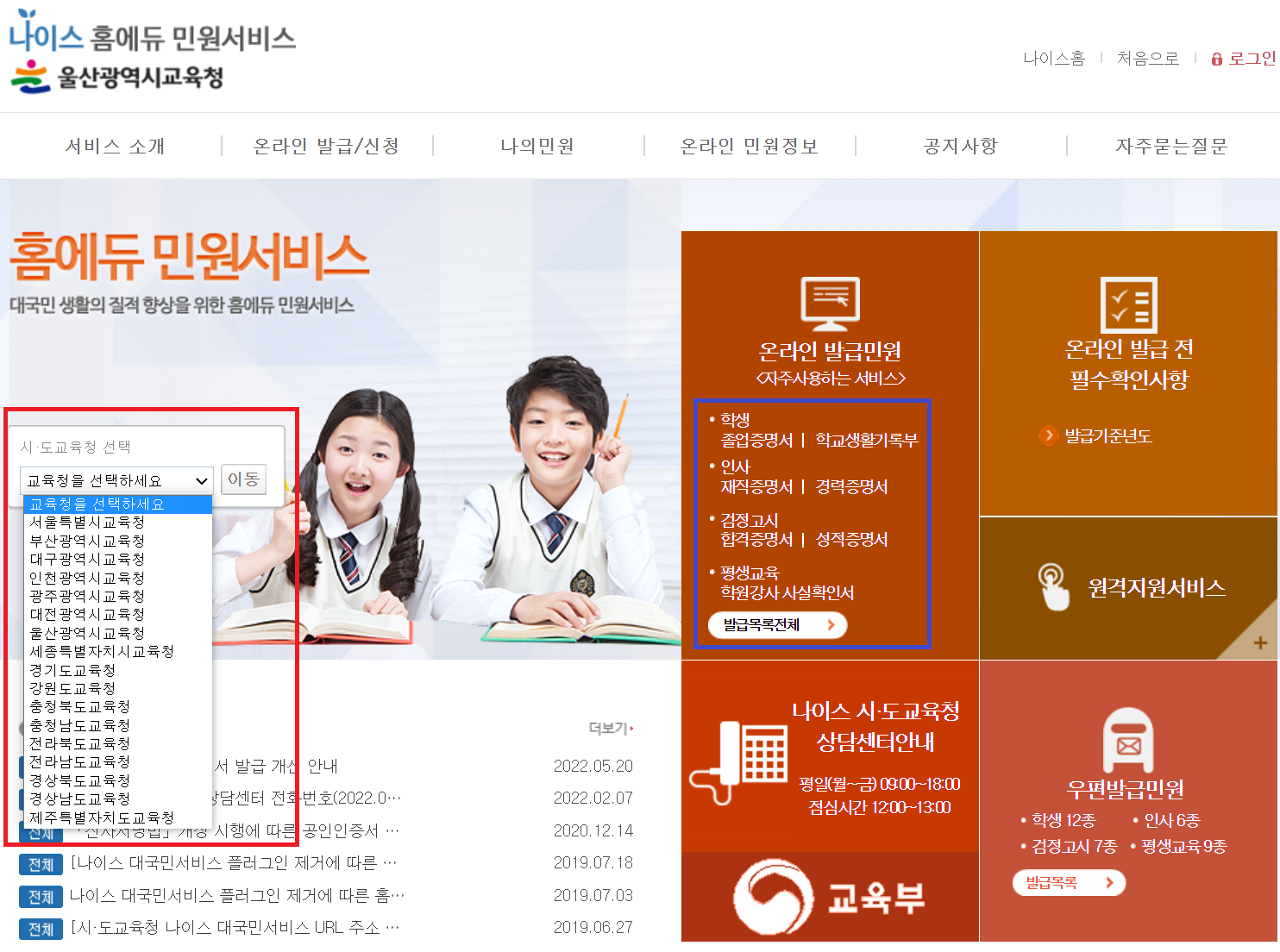 2. 내가 졸업한 학교의 관할 교육청을 선택한 뒤 온라인 발급민원에서 졸업증명서를 클릭하고 신청절차에 따라 졸업증명서 발급을 진행합니다.