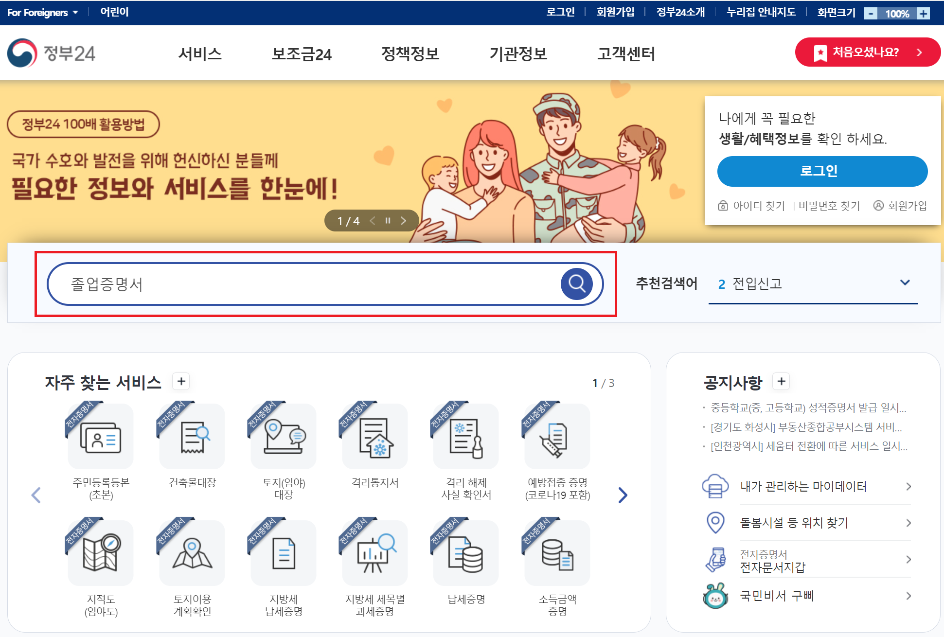 1. 정부24 홈페이지(https://www.gov.kr/portal/main)에 접속하여 졸업증명서를 검색합니다.