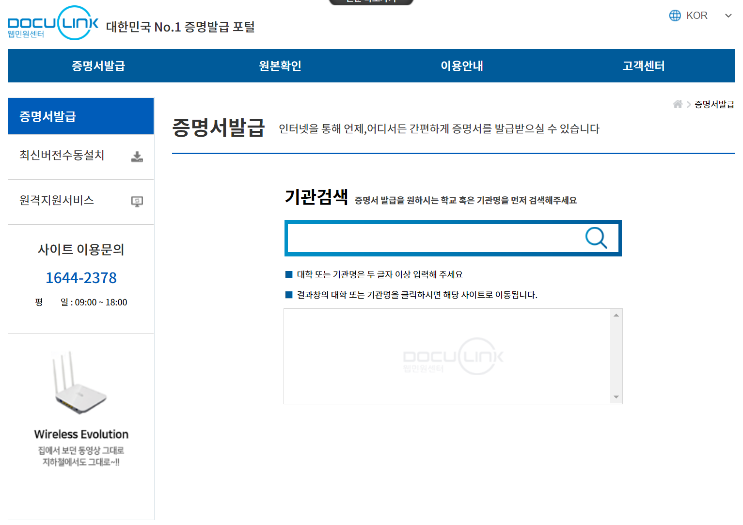 대학교에서 발급하는 각종 증명서를 신청하실 수 있는 사이트입니다. 정부24와 달리 온라인으로 신청하여 프린터로 바로 발급받으실 수 있지만, 대행수수료가 별도로 부과되고 일부 대학은 서비스를 지원하지 않아 졸업증명서를 신청하지 못하는 경우도 있습니다.