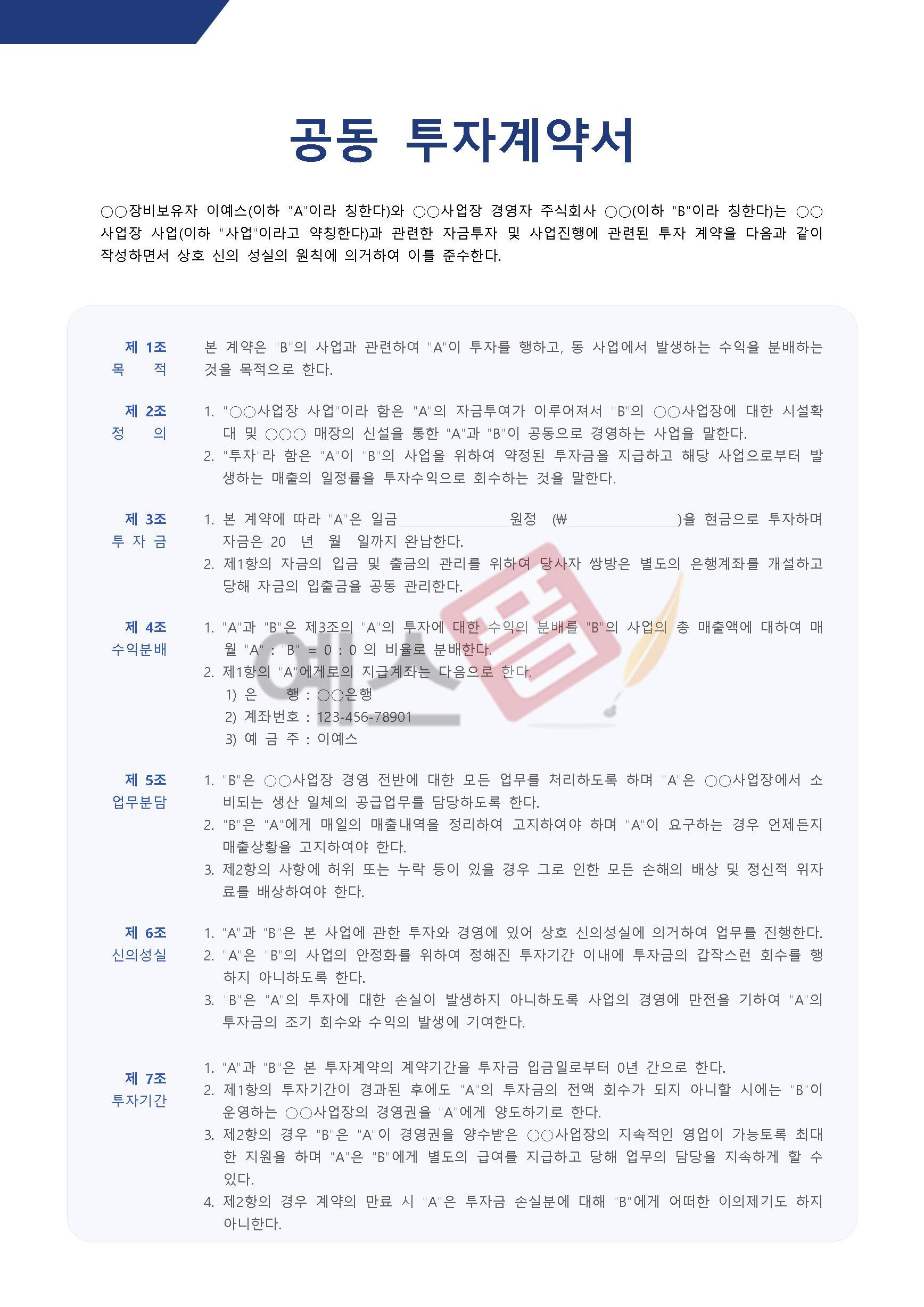 이에 대한 내용으로는 공동투자약정서를 작성하는 목적과 정의, 상대방과 내가 투자하는 금액, 공동투자에 대한 수익이 발생할 경우 분배할 방법, 공동투자와 관련된 업무 분담 시 각자가 담당할 범위, 공동투자에 대한 기간과 투자금 회수, 공동투자 해지 방법, 일반적인 사항, 공동투자 중 분쟁 시 관할 및 해결 방법, 신의성실의무, 비밀유지 의무, 기타 특약사항 등이 있으니 작성 시 꼭 참고하시어 약정서 내 항목을 구성해 보시기 바라겠습니다.