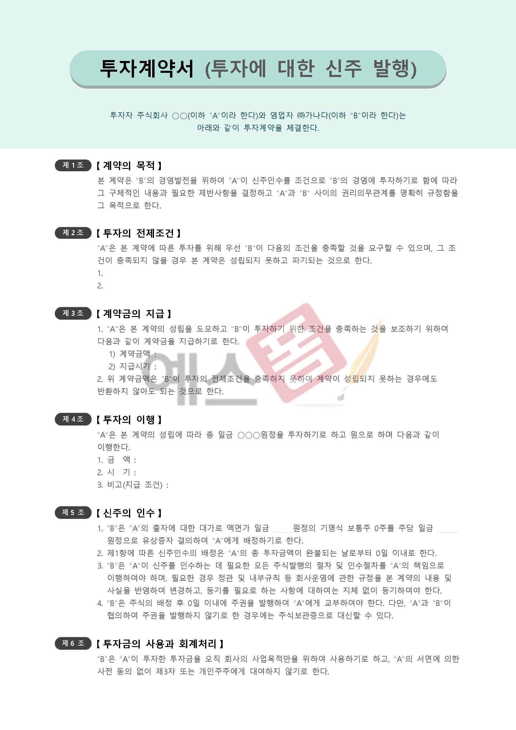 | 공동투자 계약서 | 변호사 항목해설 | 공동 투자계약서 | 투자계약서(투자에 대한 신주 발행) |