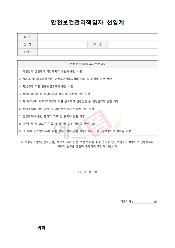 | 안전보건관리책임자 선임계 | 분기별 산업안전보건위원회 회의록 | 소규모 안전관리계획서 검토확인서 |