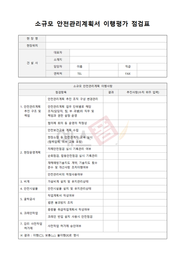 | 소규모 안전관리계획서 승인 신청서 | 소규모 안전관리계획서 이행평가 점검표 | 안전보건관리 준수 서약서 |
