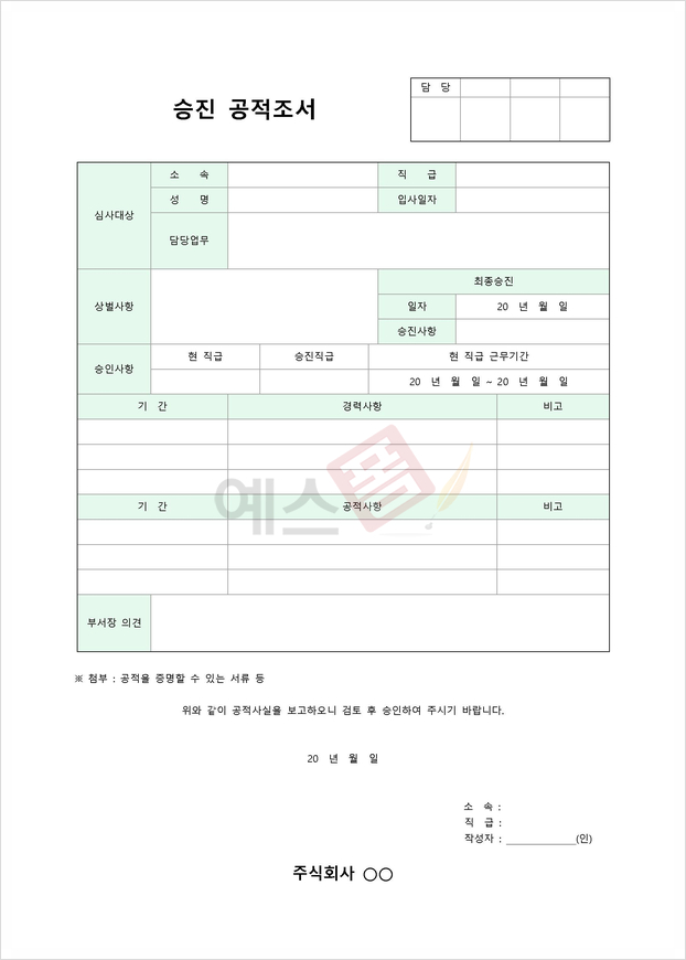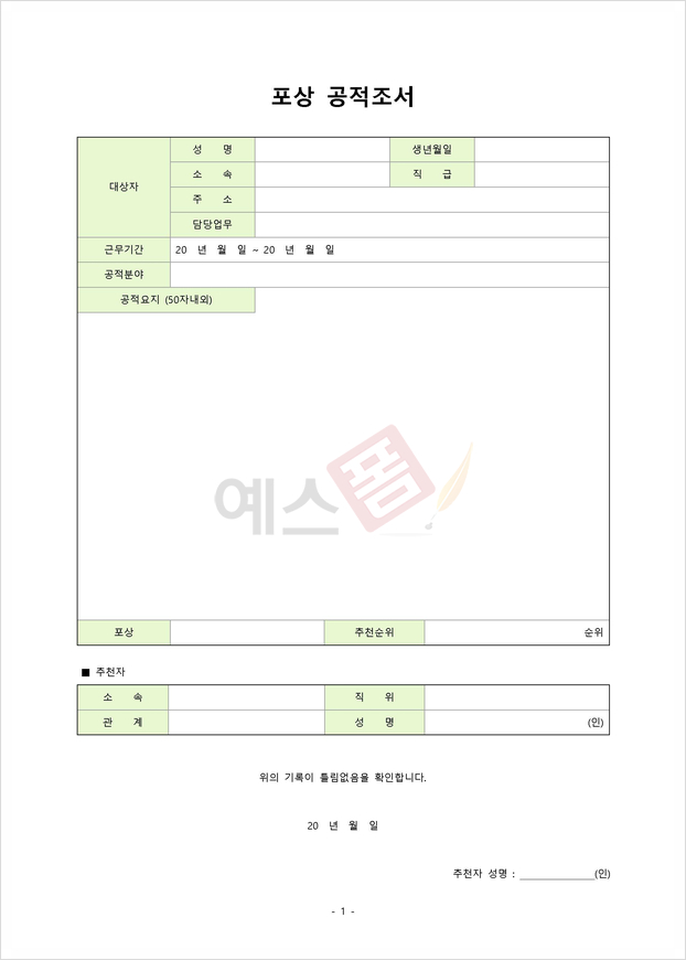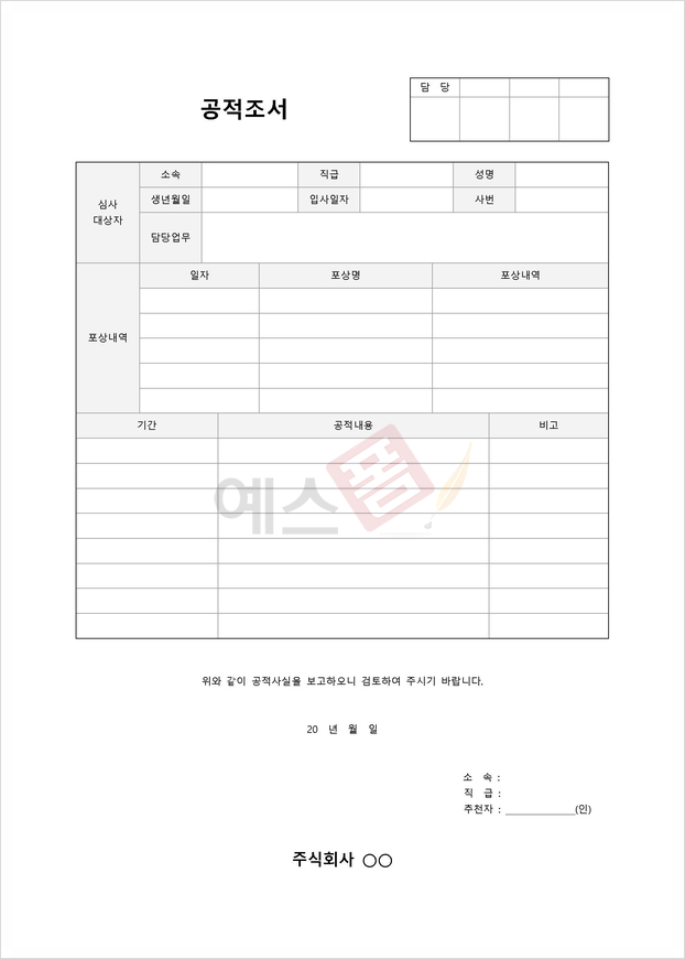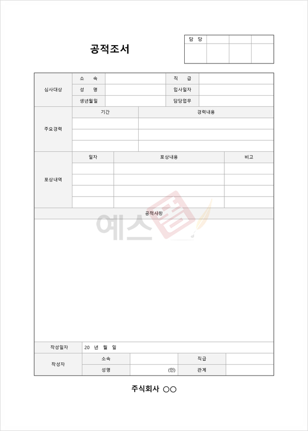 공적조서 서식(주요경력) 공적조서 서식(포상 내역) 우수사원 표창 공적조서 양식